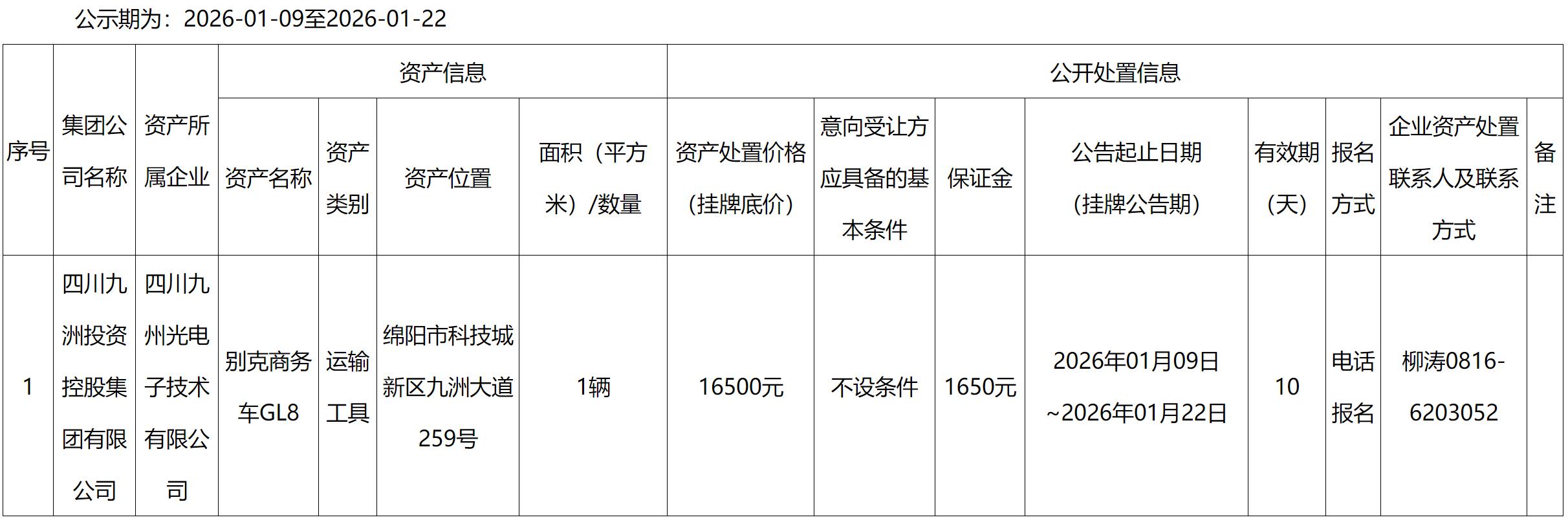 四川九州光電子技術(shù)有限公司車(chē)輛處置公告