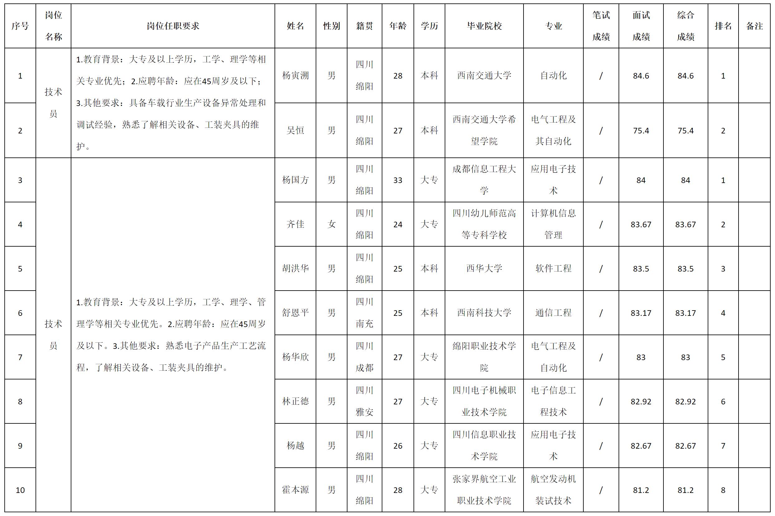 根據四川九州電子科技股份有限公司發(fā)布的招聘公告及招聘相關規(guī)定,現將測試成績予以公示。