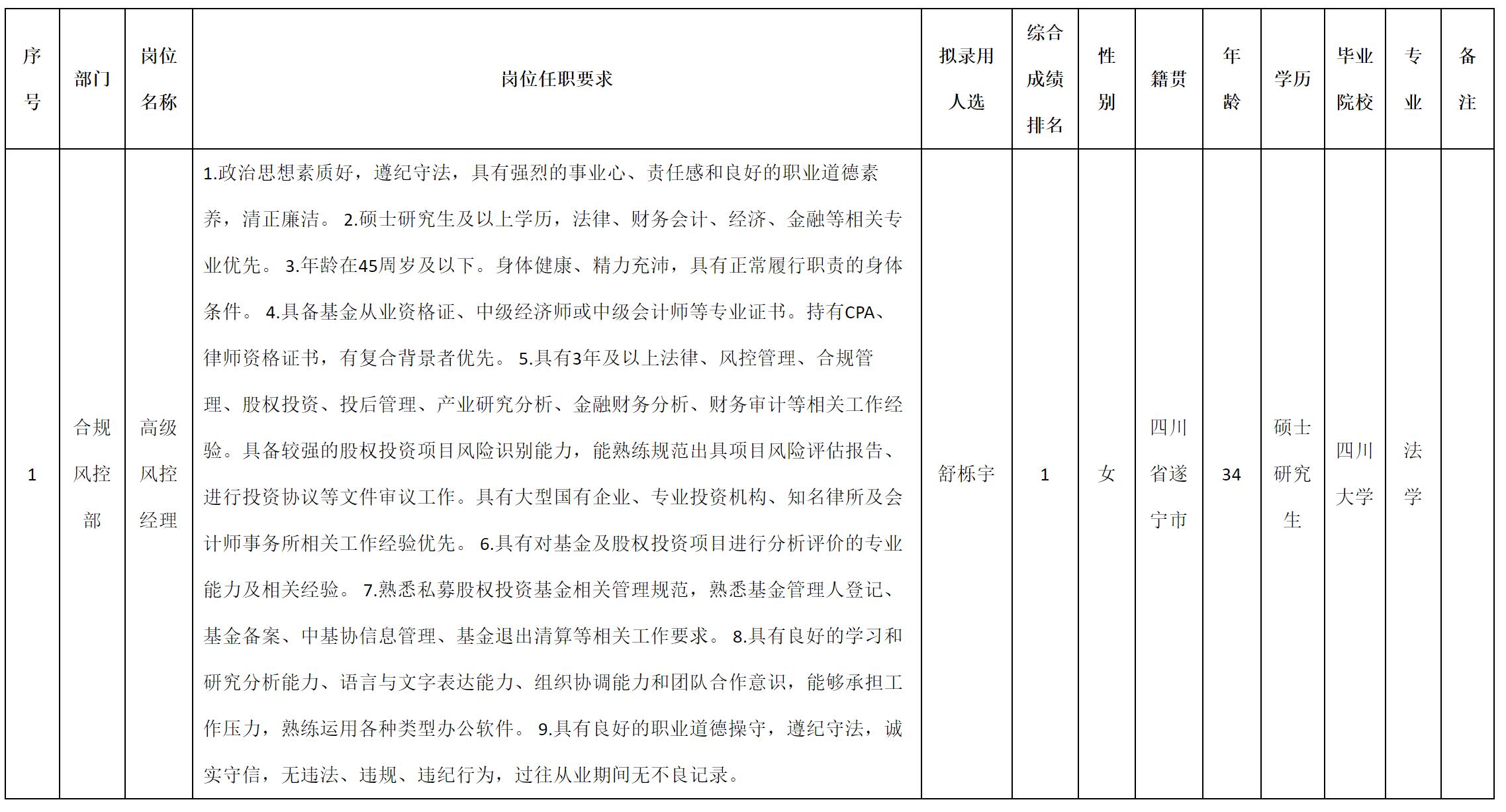 根據(jù)四川九洲君合私募基金管理有限公司發(fā)布的招聘公告及招聘相關規(guī)定,經(jīng)測試、考察、體檢等程序,擬錄用舒櫟宇同志到四川九洲君合私募基金管理有限公司工作,現(xiàn)予以公示,具體情況如下: