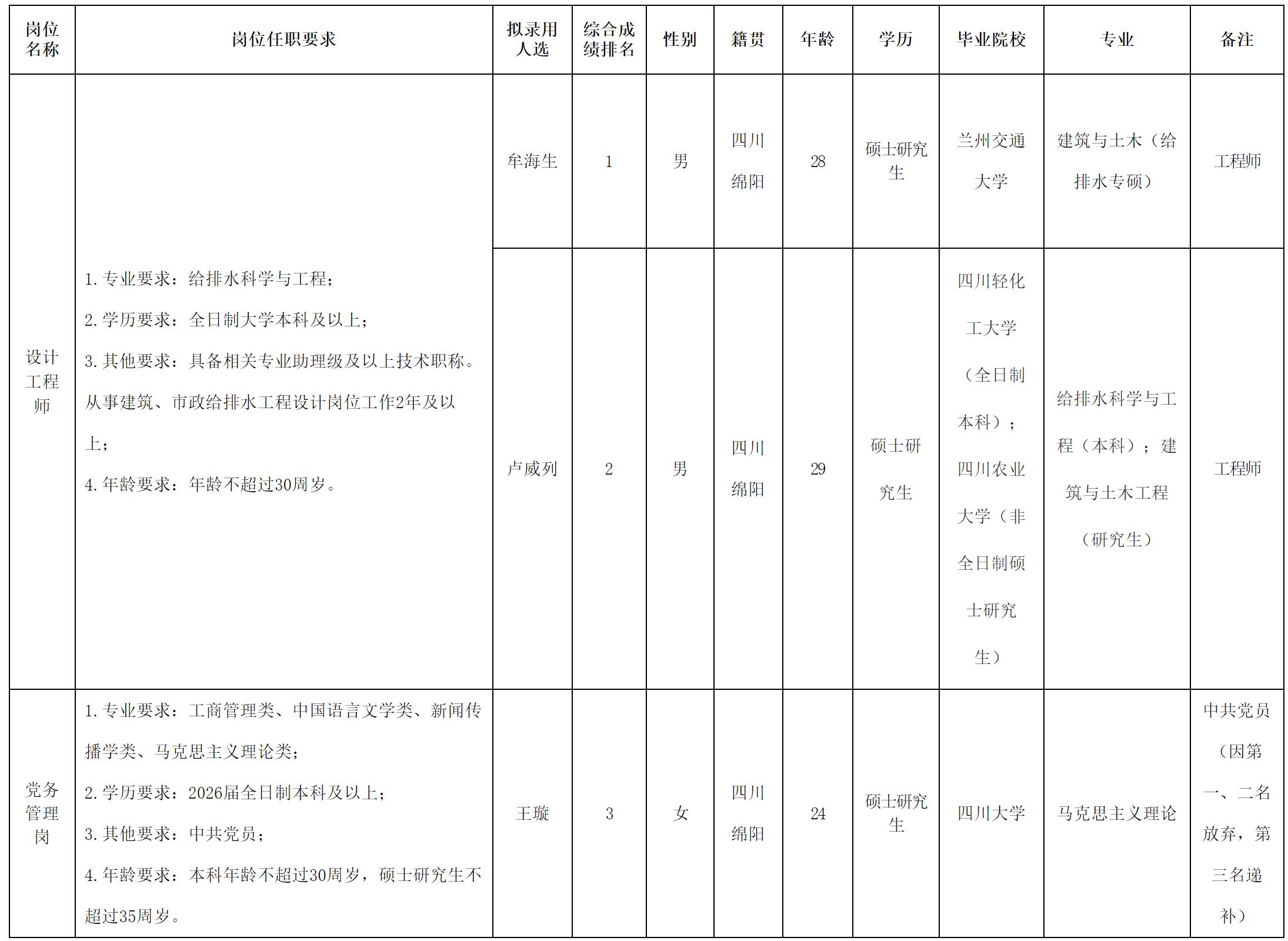 根據(jù)綿陽(yáng)市水務(wù)(集團(tuán))有限公司發(fā)布的招聘公告及招聘相關(guān)規(guī)定,經(jīng)筆試、面試、考察、體檢等程序,擬錄用牟海生、盧威列、王璇同志到綿陽(yáng)市水務(wù)(集團(tuán))有限公司工作,現(xiàn)予以公示,具體情況如下: