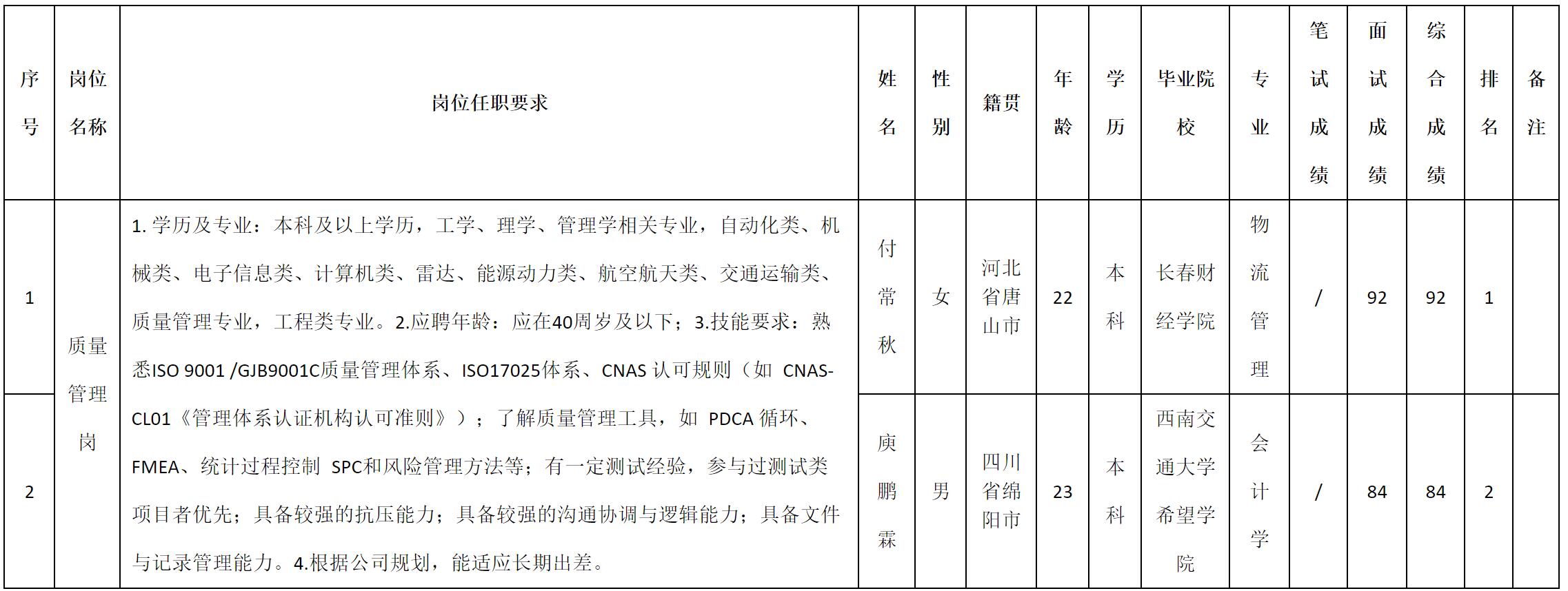根據(jù)綿陽科技城低空裝備檢驗檢測認證有限責(zé)任公司發(fā)布的招聘公告及招聘相關(guān)規(guī)定,現(xiàn)將測試成績予以公示。