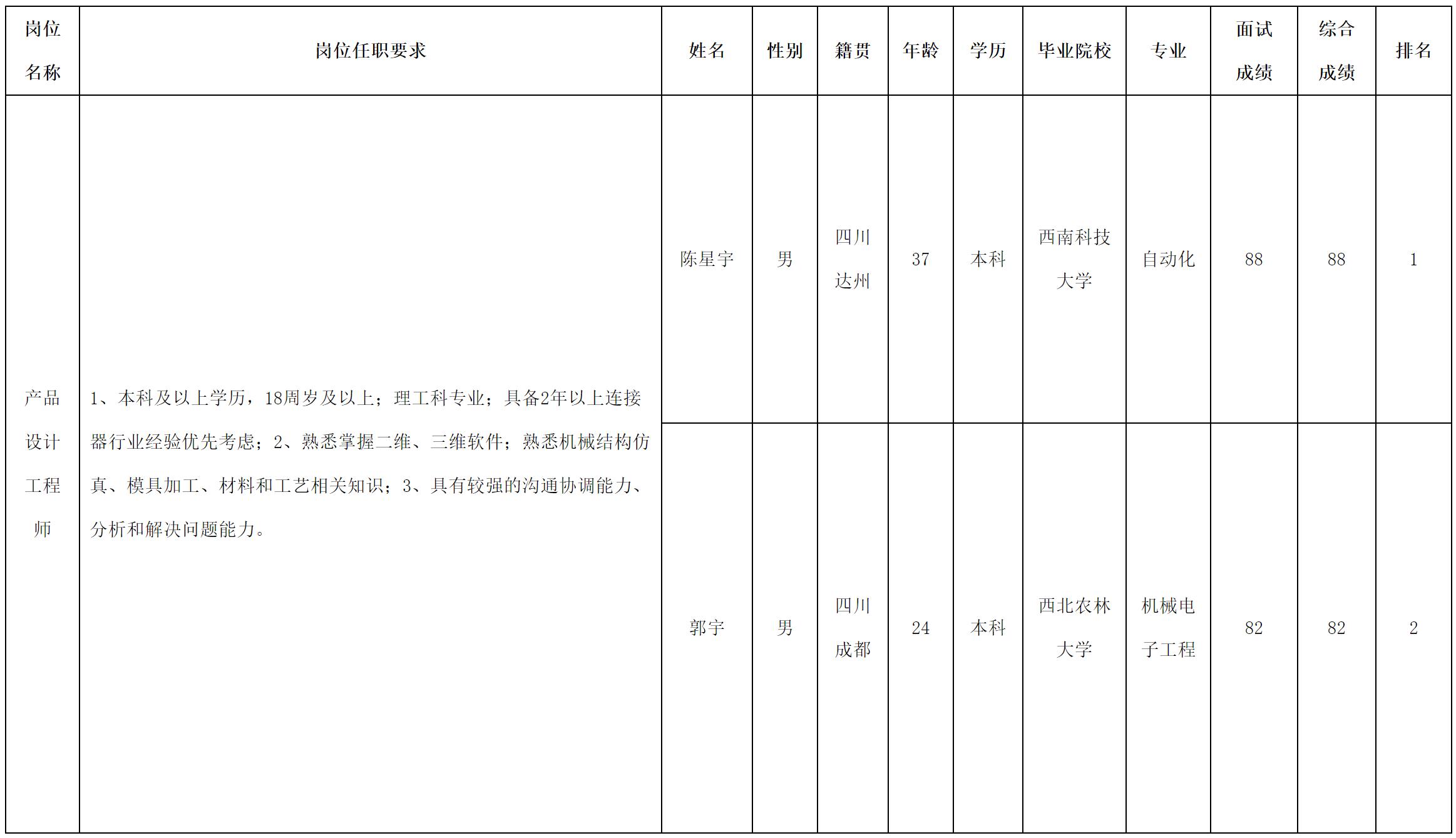 根據(jù)四川華豐科技股份有限公司發(fā)布的招聘公告及招聘相關(guān)規(guī)定,經(jīng)面試等程序,現(xiàn)將面試成績予以公示。