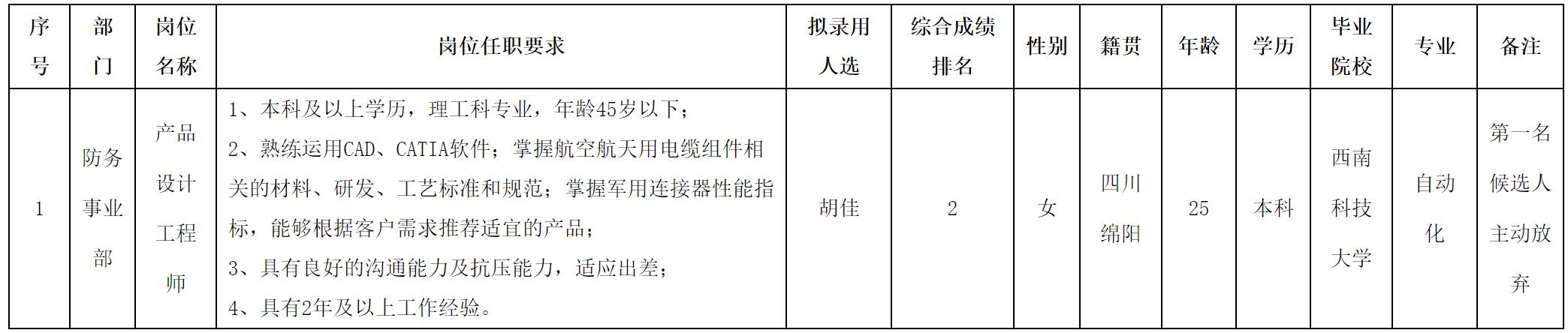 根據(jù)四川華豐科技股份有限公司發(fā)布的招聘公告及招聘相關(guān)規(guī)定,經(jīng)測試等程序,擬錄用胡佳同志到四川華豐科技股份有限公司工作,現(xiàn)予以公示,具體情況如下: