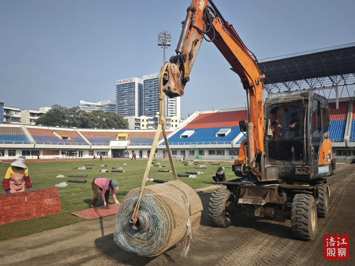 記者在施工現(xiàn)場看到,從草皮鋪設(shè)到看臺地板刷漆,再到主客隊休息室的全面翻新,各項改造工作有條不紊。在球場草皮鋪設(shè)現(xiàn)場,機械與人工緊密配合,協(xié)同作業(yè)。施工人員分工明確、配合默契,有的負責搬運,有的鋪設(shè)。為確保每一片草皮都能與地面緊密貼合,工人們?nèi)褙炞ⅲ环胚^任何一個細節(jié)。