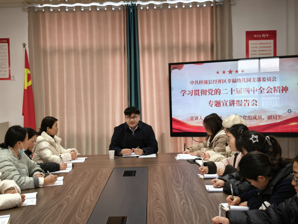 為了精準(zhǔn)傳遞黨的二十屆四中全會精神內(nèi)核,切實統(tǒng)一全園教職工思想行動,筑牢幼兒園高質(zhì)量發(fā)展的思想根基,1 月 13 日,梓潼縣教體局黨組成員、副局長黃國園蒞臨幸福幼兒園,面向全體教職工開展了以“深化思想引領(lǐng) 凝聚發(fā)展合力”為主題的宣講會活動。宣講會緊扣全會精神實質(zhì),深度融合學(xué)前教育實踐,為全園教職工帶來了一場兼具理論高度與實踐溫度的思想盛宴。