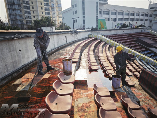 看臺(tái)區(qū)域,工人們正在翻新地板,待全面完工后,全新的地板不僅美觀大方,而且更加耐用,將為觀眾帶來更好的觀賽體驗(yàn)。