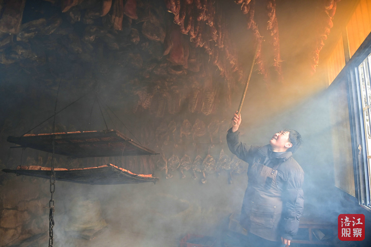 黃彥家的廚房里正在熏制臘肉。
