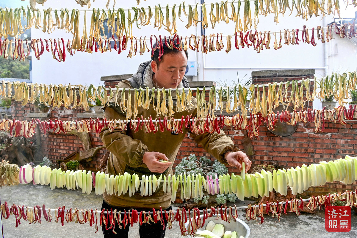 陳繼良在晾曬蘿卜干。