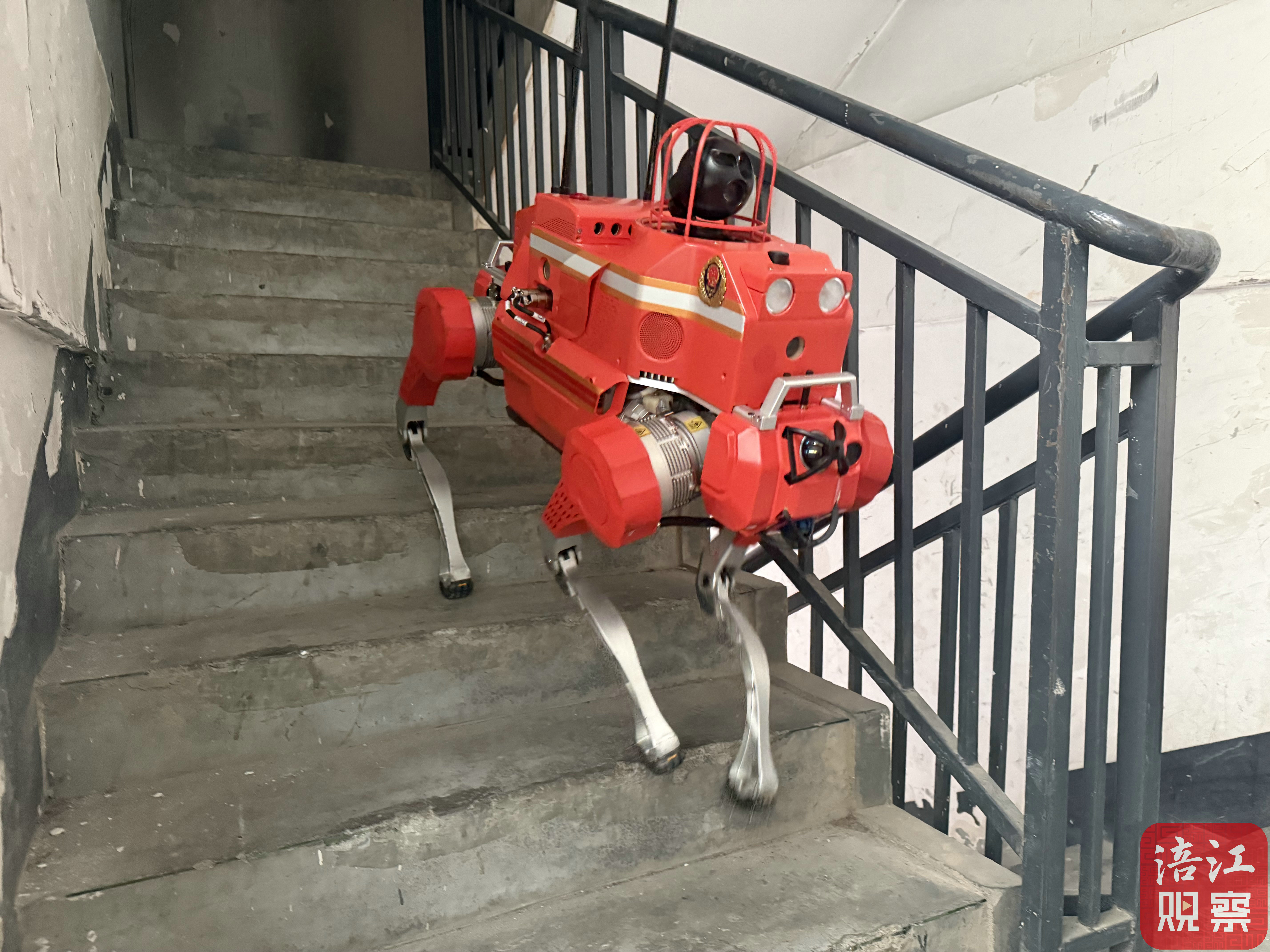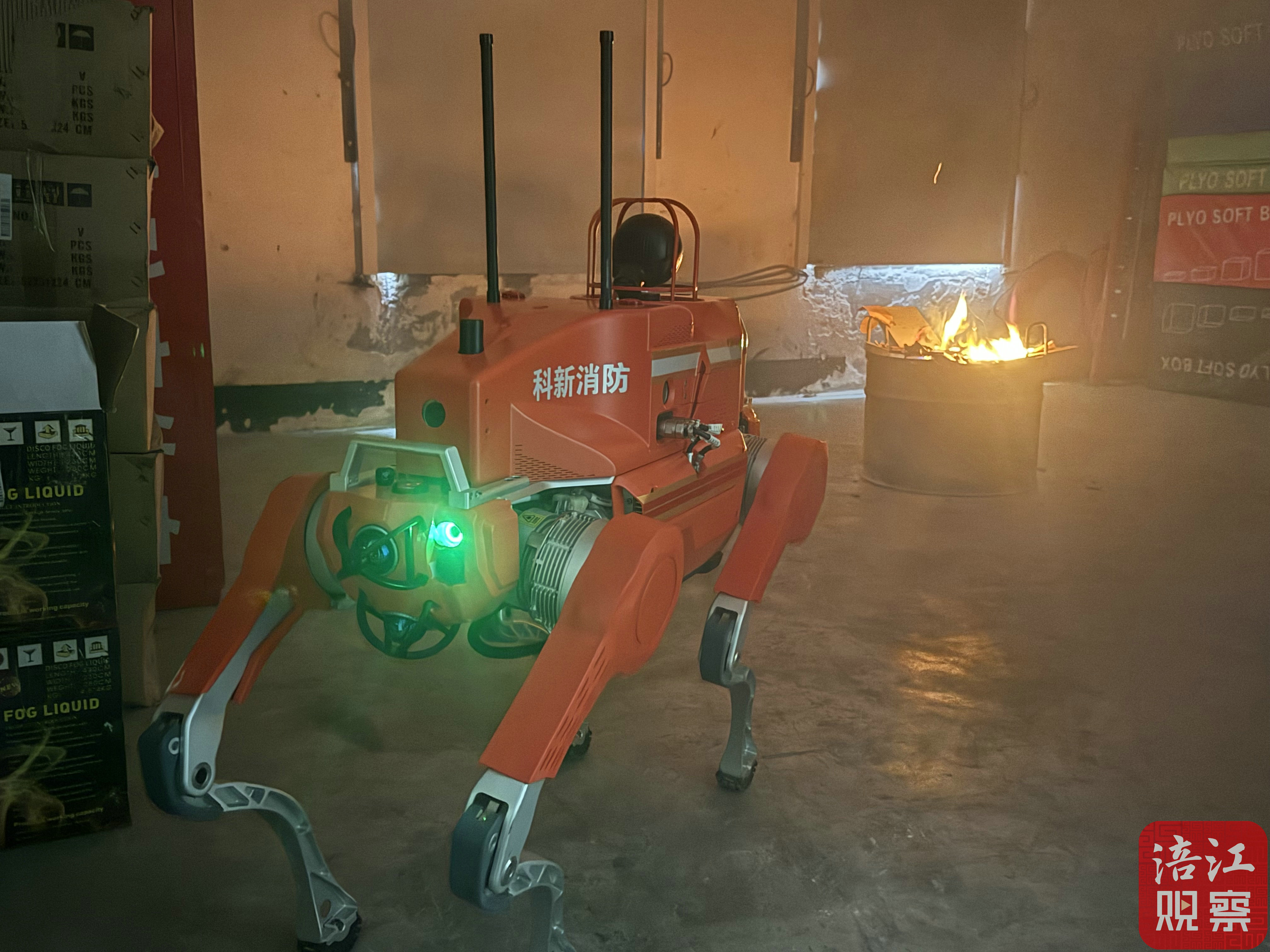 一身亮橙色的“消防服”,搭配金屬質(zhì)感的機械腿,跑起來自帶“噠噠噠”的節(jié)奏感,像極了剛領到新裝備就急著出任務的熱血少年。背上兩卷粗壯的消防水帶,活像背著巨型“能量面包”,兩根天線高高豎起,宛如一對傲嬌的小耳朵,時刻接收指揮中心的信號,身體兩側(cè)印有的“科新消防”“綿陽消防”幾個大字格外顯眼。