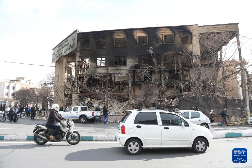 1月21日,在伊朗首都德黑蘭,車輛經(jīng)過在近期騷亂中受損的一處稅務(wù)局建筑。新華社記者 沙達提 攝