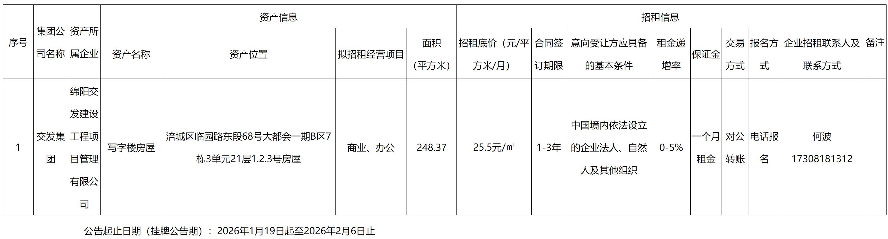 綿陽(yáng)交發(fā)建設(shè)工程項(xiàng)目管理有限公司經(jīng)營(yíng)性資產(chǎn)招租公告
