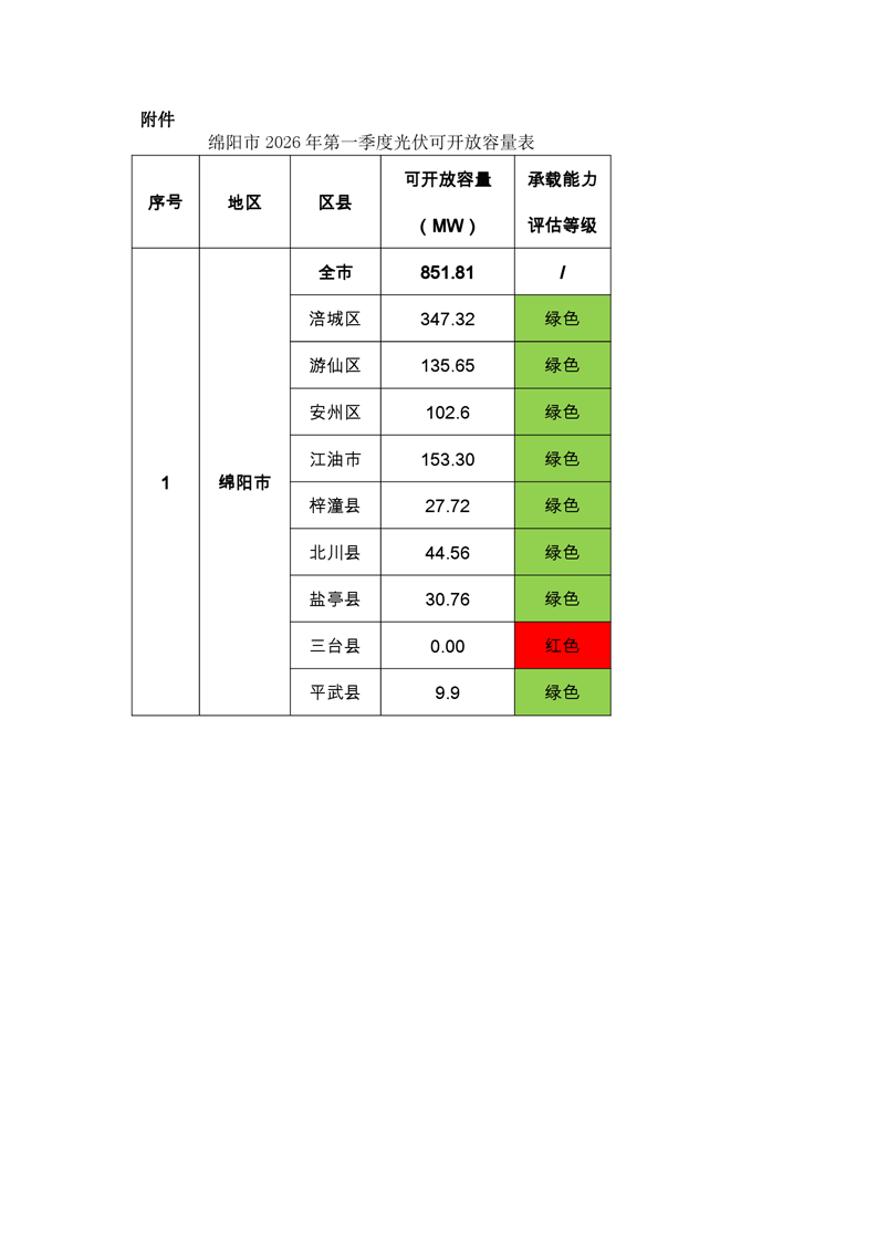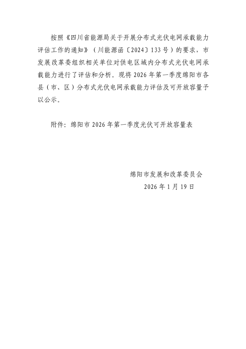 綿陽(yáng)市發(fā)展和改革委員會(huì)關(guān)于對(duì)2026年第一季度分布式光伏電網(wǎng)承載能力評(píng)估及可開放容量的公示