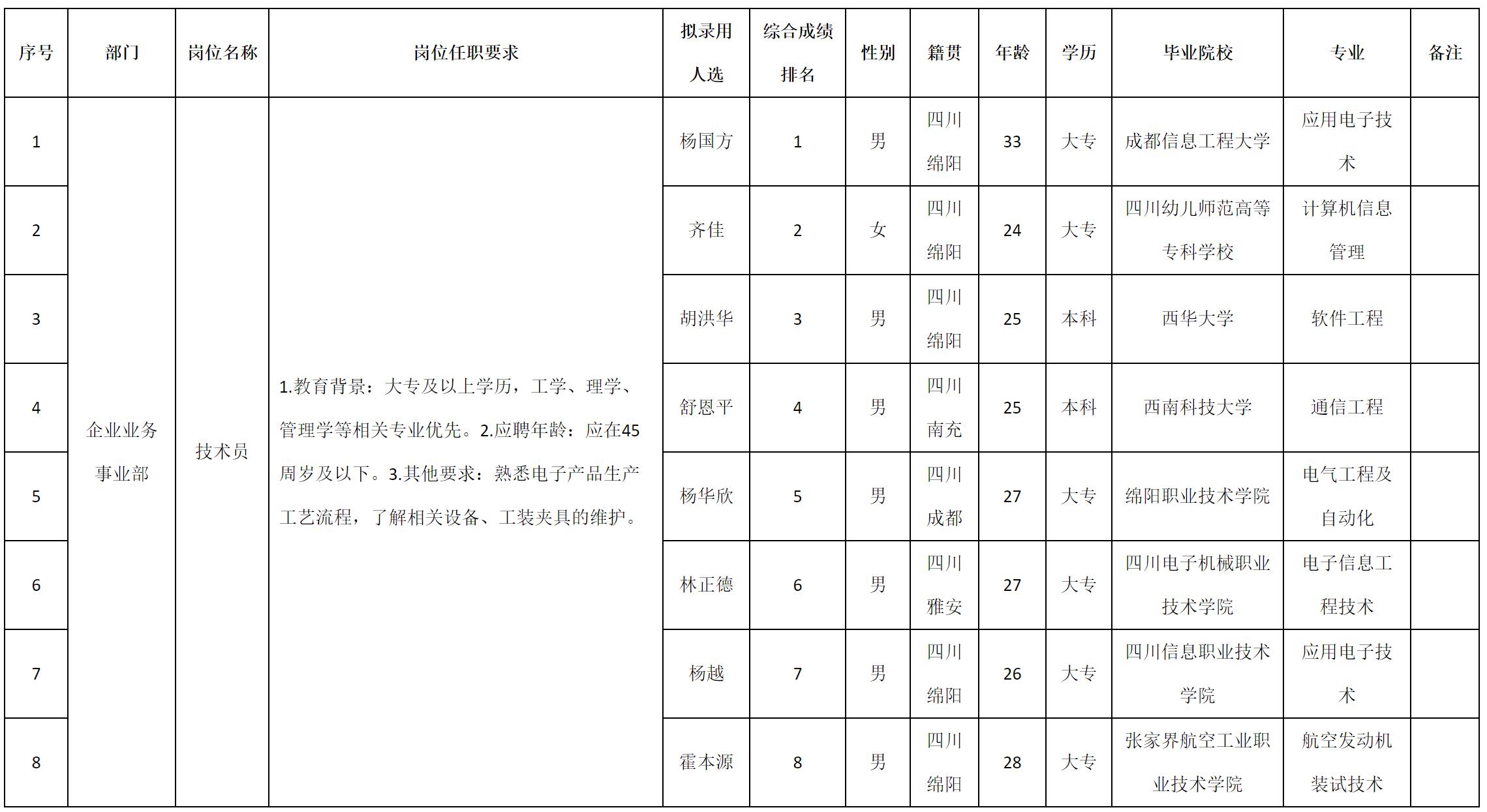 根據(jù)四川九州電子科技股份有限公司發(fā)布的招聘公告及招聘相關(guān)規(guī)定,經(jīng)測(cè)試、考察、體檢等程序,擬錄用楊國方等8名同志到四川九州電子科技股份有限公司工作,現(xiàn)予以公示,具體情況如下:
