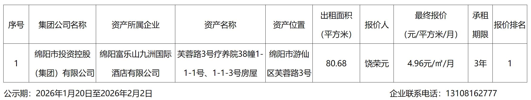 綿陽(yáng)富樂山九洲國(guó)際酒店有限公司資產(chǎn)出租結(jié)果公示