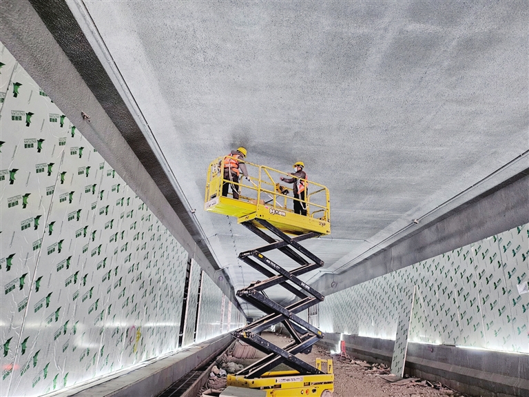 該項目包括臨園路下穿隧道工程和站前廣場改造工程兩部分。其中,臨園路下穿隧道工程已于1月5日完成主體結構,計劃春節(jié)前實現(xiàn)通車。“目前隧道施工已進入收尾沖刺階段,U型槽側墻石材已經(jīng)裝完,截水溝和防撞石施工已于1月22日完工。同時,照明、監(jiān)控將在本月底安裝完畢,側墻裝飾板材將在1月28日完工,地面找平也在穩(wěn)步推進,頂板土方回填有序進行,預計春節(jié)前達到通車條件。”海丹介紹,下穿隧道在設計時,還預留了一條南北走向的人行下穿隧道。待站前廣場改造工程完工,該隧道將直接連通站前廣場負一樓。屆時,出站旅客可通過人行下穿隧道橫穿臨園干道。