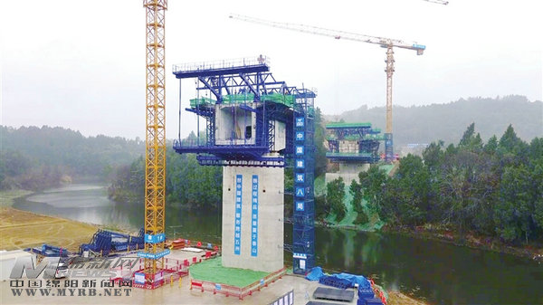 橫跨三臺縣劉營鎮(zhèn)與靈興鎮(zhèn)的蘇家河特大橋,是推動區(qū)域高鐵網(wǎng)絡(luò)建設(shè)的關(guān)鍵工程。大橋全長720.75米,最高墩達23.5米,共計45個節(jié)段,采用2組掛籃對稱施工。目前,橋梁下部結(jié)構(gòu)已完成70%,懸澆連續(xù)梁10#、11#主墩0號塊均已澆筑完成,掛籃拼裝作業(yè)正加快推進。