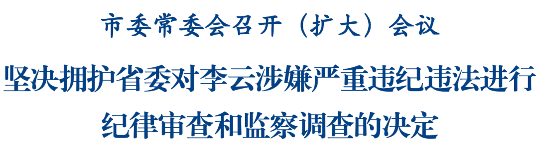會議指出,省紀委監(jiān)委對李云涉嫌嚴重違紀違法進行紀律審查和監(jiān)察調(diào)查,充分彰顯了省委持之以恒推進全面從嚴治黨的堅定決心和堅強意志,再次釋放了違紀違法沒有安全地帶、一朝腐敗必將終身追責的強烈信號,同時也反映出反腐敗斗爭形勢依然嚴峻復雜,鏟除腐敗滋生的土壤和條件仍然任重道遠。市委堅決擁護省委決定,堅決擁護省紀委監(jiān)委決定,全力協(xié)助配合省紀委監(jiān)委開展審查調(diào)查。全市各級黨組織要切實把思想和行動統(tǒng)一到黨中央關于全面從嚴治黨的部署要求上來、統(tǒng)一到省委決定精神上來,深刻汲取教訓,以案為鑒、警鐘長鳴,一體推進不敢腐、不能腐、不想腐,堅決打好反腐敗斗爭攻堅戰(zhàn)、持久戰(zhàn)、總體戰(zhàn)。要堅持用改革精神和嚴的標準管黨治黨,強化對“一把手”和領導班子的監(jiān)督,加大風腐同查同治力度,使各項紀律規(guī)矩真正成為“帶電的高壓線”,確保黨和人民賦予的權力始終在正確的軌道上運行。市政府黨組要堅定不移貫徹全面從嚴治黨方針,以更高標準、更嚴要求加強自身建設,做到按程序決策、按規(guī)矩辦事、按制度落實,著力建設廉潔政府。要不斷增強推進全面從嚴治黨、深化黨風廉政建設的責任擔當,對職責范圍內(nèi)的問題敢管敢治、嚴管嚴治,緊盯權力集中、資金密集、資源富集的行業(yè)領域扎緊制度籠子,鏟除腐敗滋生土壤。廣大黨員干部要切實鑄牢對黨絕對忠誠的政治品格,堅持不懈用黨的創(chuàng)新理論凝心鑄魂,鞏固拓展深入貫徹中央八項規(guī)定精神學習教育成果,嚴守政治紀律和政治規(guī)矩,始終做政治上的明白人、老實人。要始終保持對權力的敬畏感,帶頭尊崇黨章、遵守黨規(guī)黨紀,堅持依規(guī)依法開展工作,自覺做到秉公用權、依法用權、廉潔用權。要帶頭發(fā)揚自我革命精神,從嚴要求自己,管好家屬和身邊工作人員,自覺接受監(jiān)督,自覺做到懷德自重、保持敬畏。