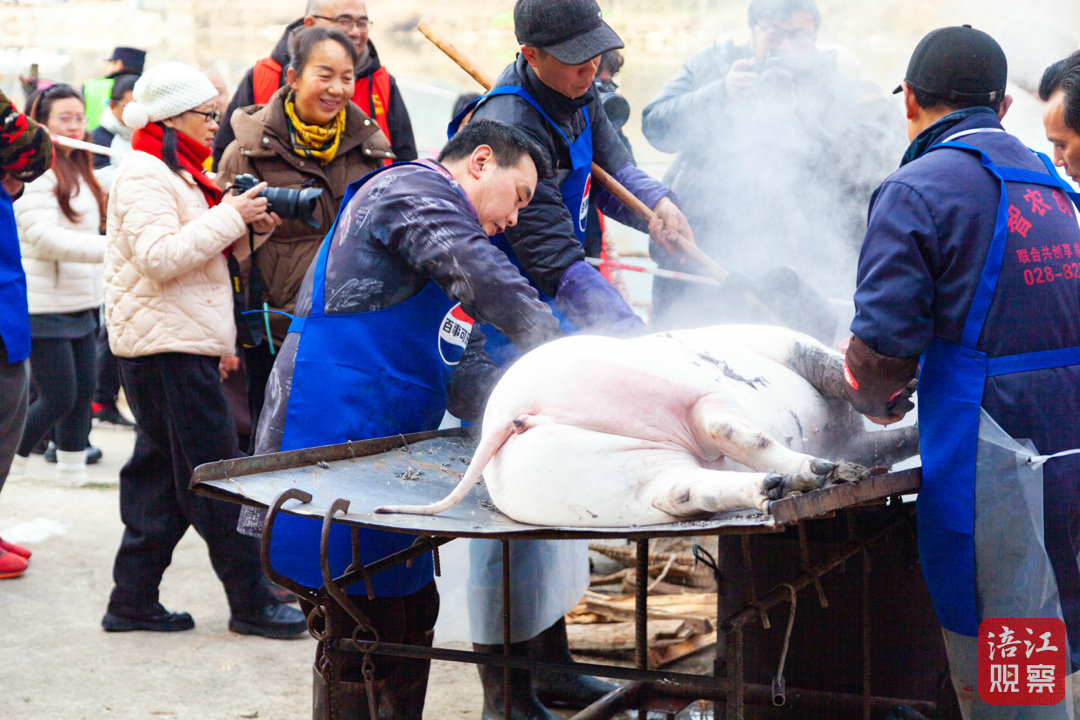 當天清晨,村民們早早分工協(xié)作,燒水、殺豬、分割食材,動作嫻熟利落。以紅星村村史館為據(jù)點,村子里熱鬧非凡,歡聲笑語不斷。