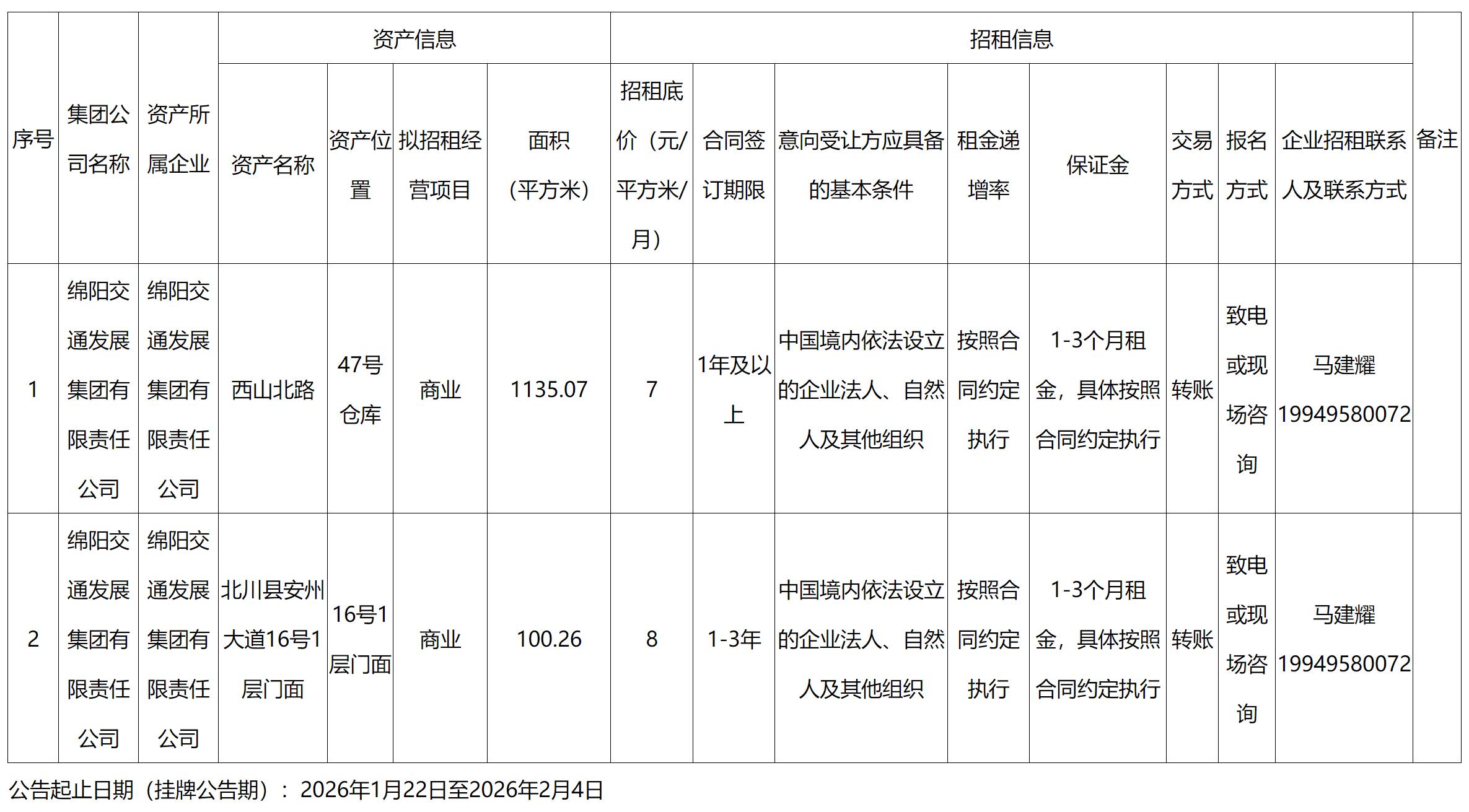 綿陽交發(fā)實業(yè)有限責(zé)任公司市內(nèi)外部分資產(chǎn)招租公告