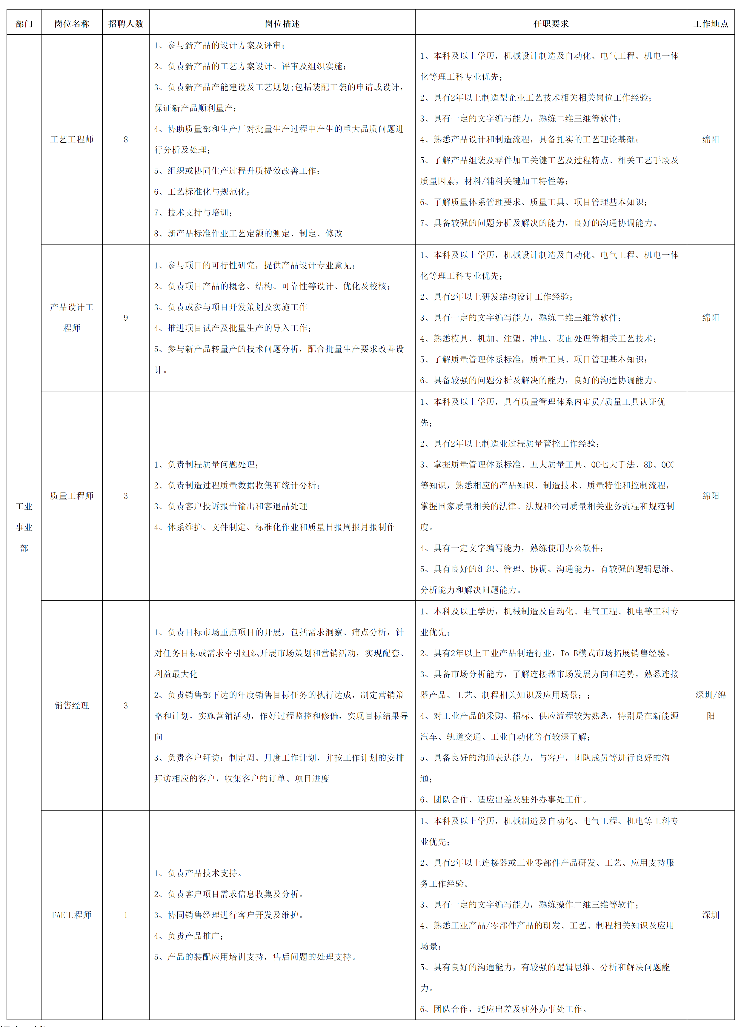 現(xiàn)因公司經(jīng)營發(fā)展需要,現(xiàn)面向長虹集團內(nèi)部、外部誠聘工藝工程師等崗位人員,具體崗位招聘信息公告如下:
