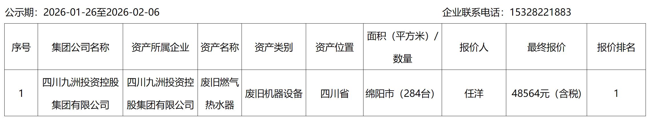 四川九洲投資控股有限公司資產(chǎn)處置結(jié)果公示