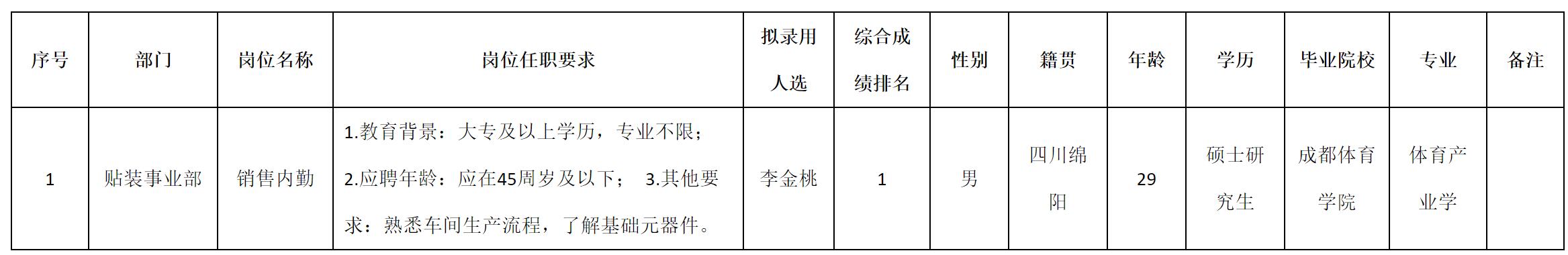 根據(jù)四川九州電子科技股份有限公司發(fā)布的招聘公告及招聘相關(guān)規(guī)定,經(jīng)測試、考察、體檢等程序,擬錄用李金桃同志到四川九州電子科技股份有限公司工作,現(xiàn)予以公示,具體情況如下: