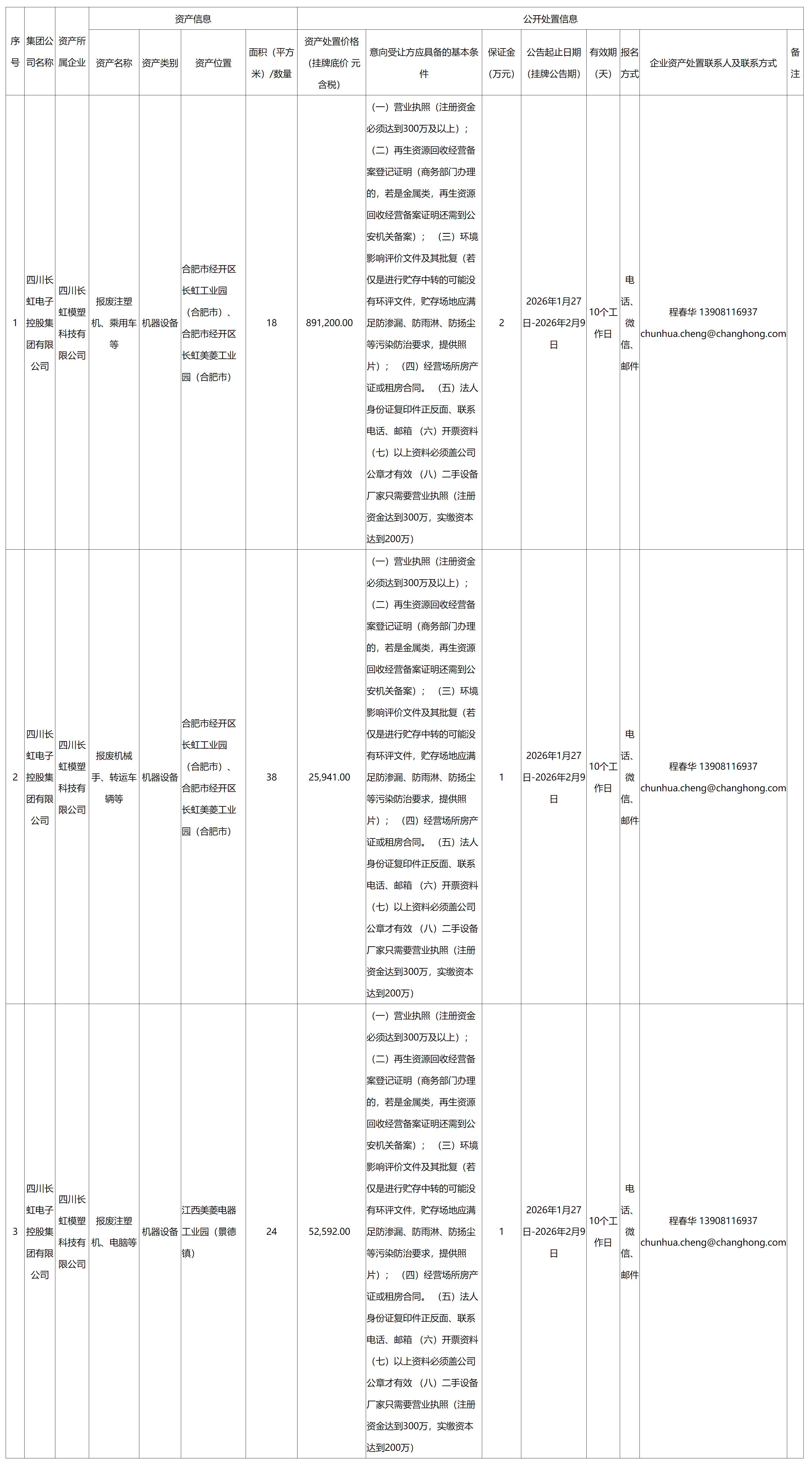 四川長(zhǎng)虹模塑科技有限公司企業(yè)資產(chǎn)處置公告