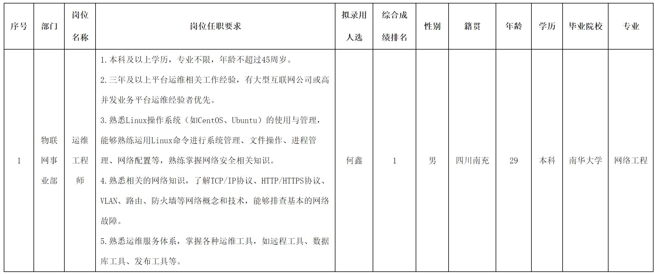 根據(jù)四川長虹新網(wǎng)科技有限責(zé)任公司發(fā)布的招聘公告及招聘相關(guān)規(guī)定,經(jīng)面試、考察、體檢等程序,擬錄用何鑫同志到公司工作,現(xiàn)予以公示,具體情況如下: