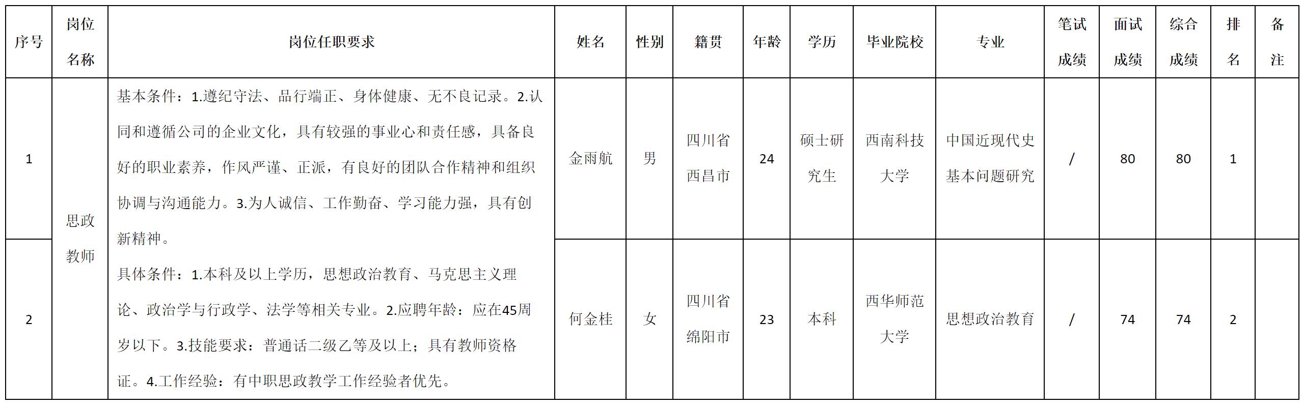 根據(jù)四川九洲教育投資管理有限公司發(fā)布的招聘公告及招聘相關(guān)規(guī)定,現(xiàn)將測試成績予以公示。