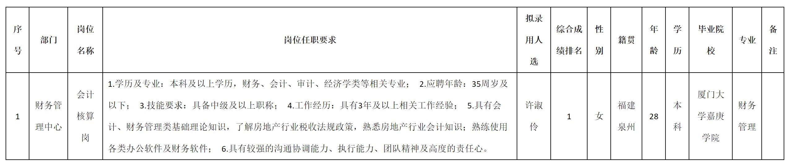 根據(jù)九洲千城置業(yè)有限責(zé)任公司發(fā)布的招聘公告及招聘相關(guān)規(guī)定,經(jīng)測(cè)試、考察、體檢等程序,擬錄用許淑伶同志到九洲千城置業(yè)有限責(zé)任公司工作,現(xiàn)予以公示,具體情況如下: