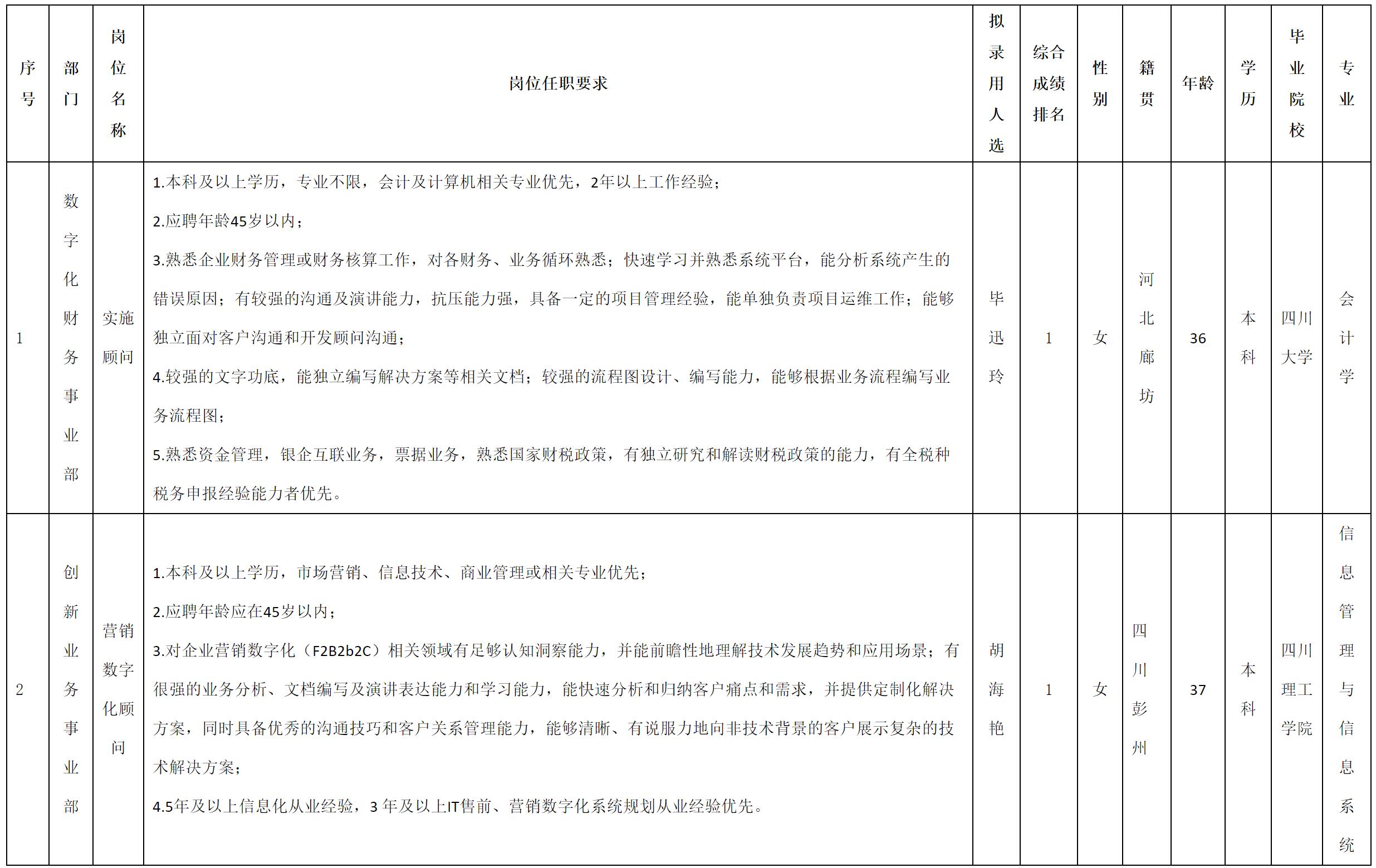 根據(jù)四川虹信軟件股份有限公司發(fā)布的招聘公告及招聘相關(guān)規(guī)定,經(jīng)測試、考察、體檢等程序,擬錄用畢迅玲、胡海艷同志到四川虹信軟件股份有限公司工作,現(xiàn)予以公示,具體情況如下: