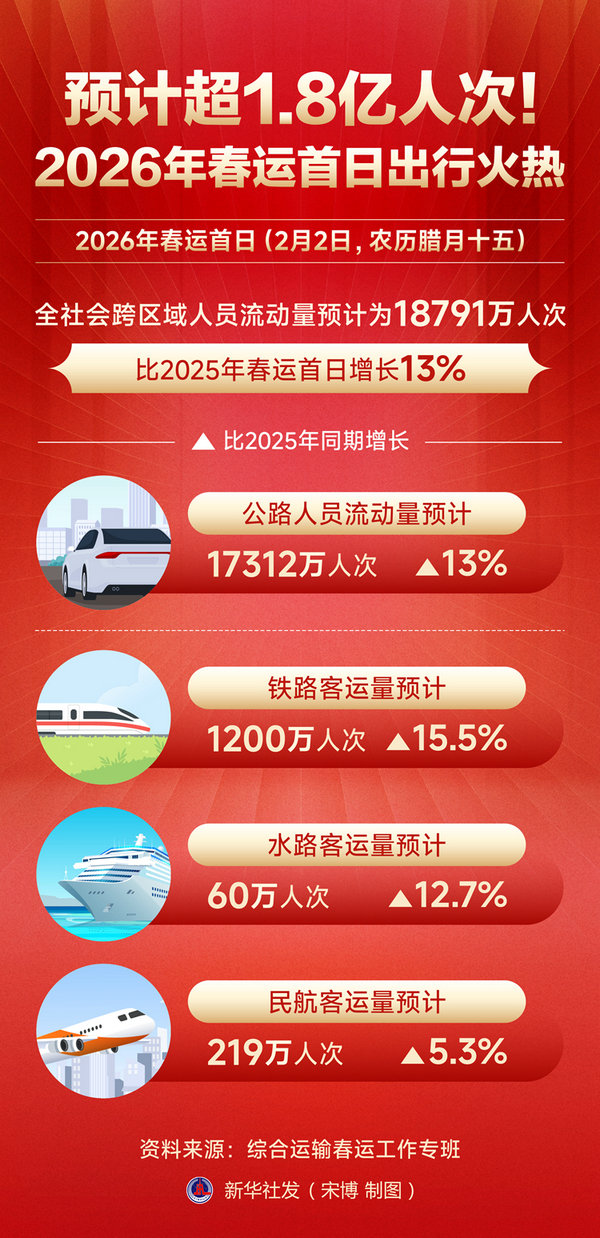 新華社北京2月2日電(記者葉昊鳴)記者2日從綜合運(yùn)輸春運(yùn)工作專(zhuān)班獲悉,根據(jù)專(zhuān)班數(shù)據(jù)顯示,2026年春運(yùn)首日(2月2日,農(nóng)歷臘月十五),全社會(huì)跨區(qū)域人員流動(dòng)量預(yù)計(jì)為18791萬(wàn)人次,比2025年春運(yùn)首日增長(zhǎng)13%。