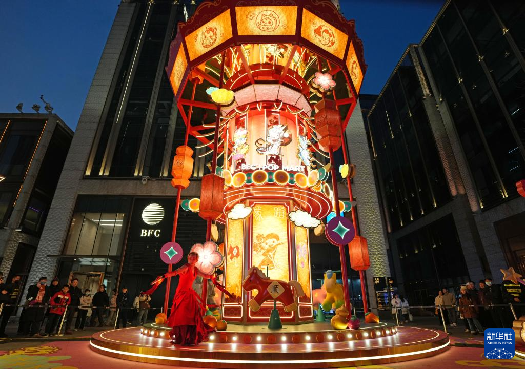 2月1日晚,宮燈造型的旋轉木馬裝置在BFC外灘金融中心前點亮,啟動新春游園會。