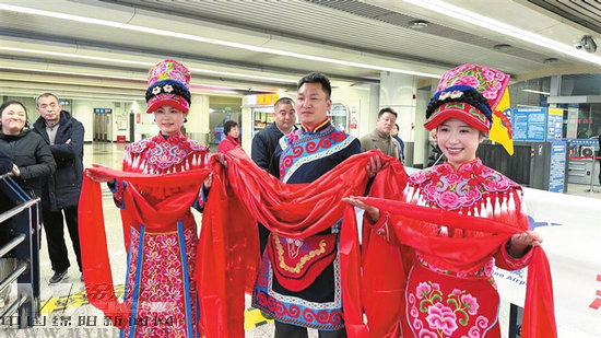 當(dāng)旅客行至機(jī)場出站大廳,身著民族服飾的羌鄉(xiāng)兒女手捧羌紅載歌載舞、微笑相迎,并把一副副定制春聯(lián)和“福”字送到旅客手中;綿陽知名餐飲“孫抄手”兌換券也隨即送到旅客手上。旅客們剛剛落地綿陽,立刻被濃濃的年味和綿陽人民的誠意包圍。