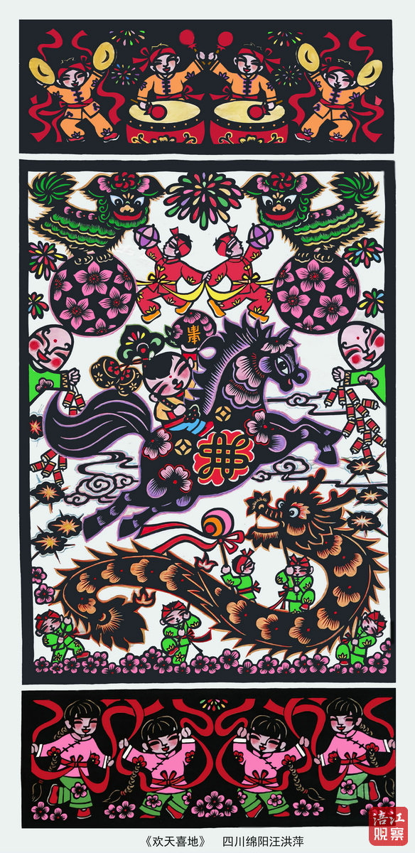 剪紙作品《歡天喜地》生動(dòng)展現(xiàn)了川西北地區(qū)春節(jié)的民俗場(chǎng)景,畫面分為上、中、下三部分:上部為敲鑼打鼓的喜慶場(chǎng)面,下部是扭秧歌的熱鬧場(chǎng)景,均以五彩斑斕的煙花烘托節(jié)日氣氛;中部以“福娃騎駿馬”為視覺核心,福娃肩扛如意與雙柿,手托壽桃,寓意“事事如意、健康長壽”。駿馬飾以花卉與中國結(jié),象征紅火吉祥。左右伴有提鞭炮的“笑頭”,更添歡快氣氛。此外,畫面中還有“獅子踩繡球”、“龍舞表演”等傳統(tǒng)元素,底部盛開的寒梅則預(yù)示著春的希望。