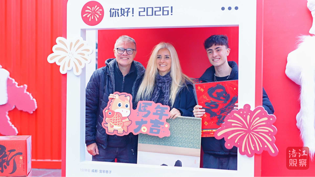 活動現(xiàn)場氣氛熱烈,來自阿根廷的游客Ticiano一家圍著大熊貓人偶拍照,還情不自禁地跟著工作人員學(xué)說中文,表達(dá)了對“青睞綿陽、歡喜過年”的心愿。外地游客歐潔宜帶著孩子在打卡裝置前留影,她笑著說:“現(xiàn)場特別熱情,氛圍很好,孩子很喜歡,我們很期待到綿陽去玩一玩,偶遇大熊貓。”
