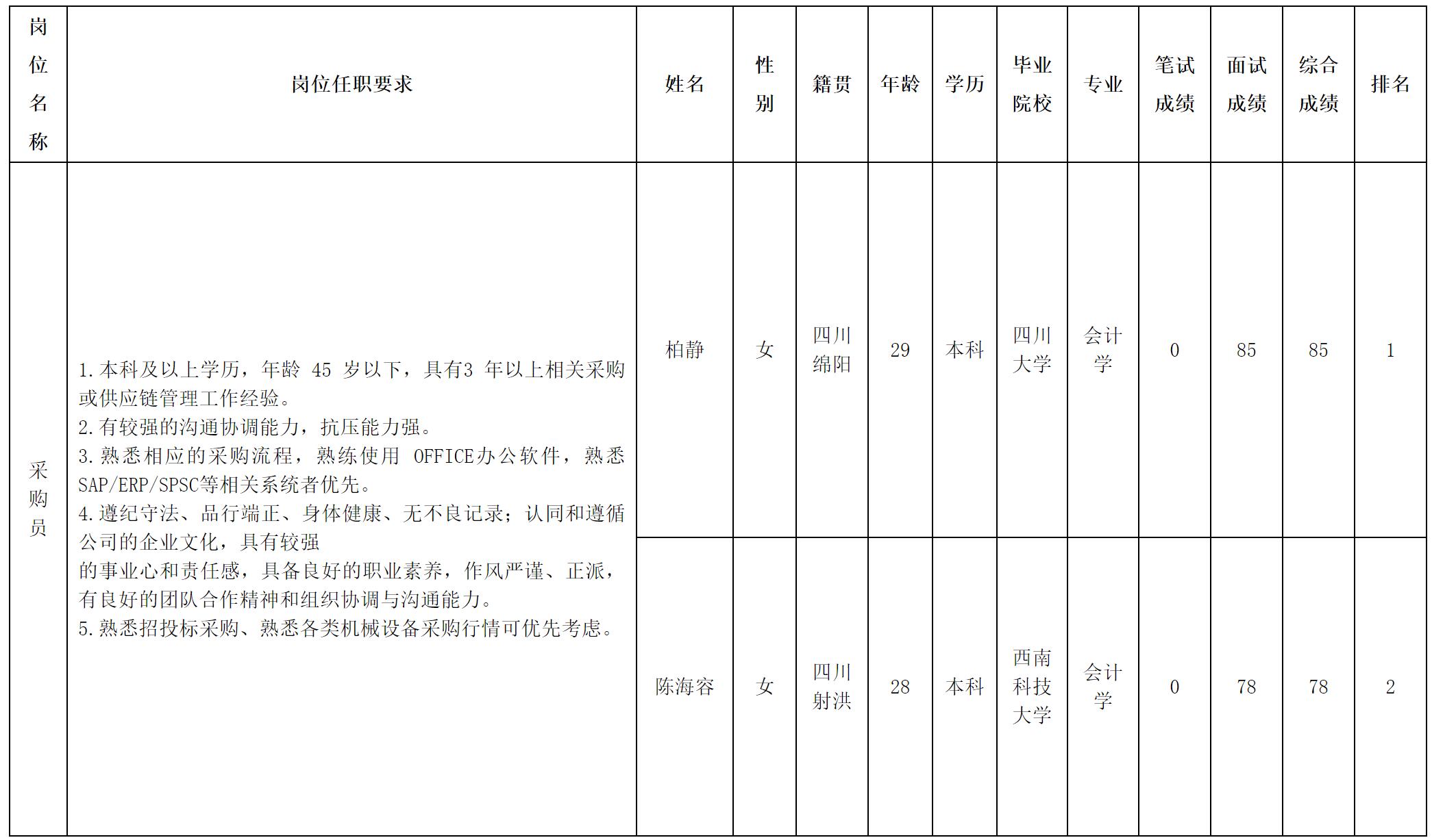 根據(jù)四川華豐科技股份有限公司發(fā)布的招聘公告及招聘相關規(guī)定,經(jīng)面試等程序,現(xiàn)將測試成績予以公示。