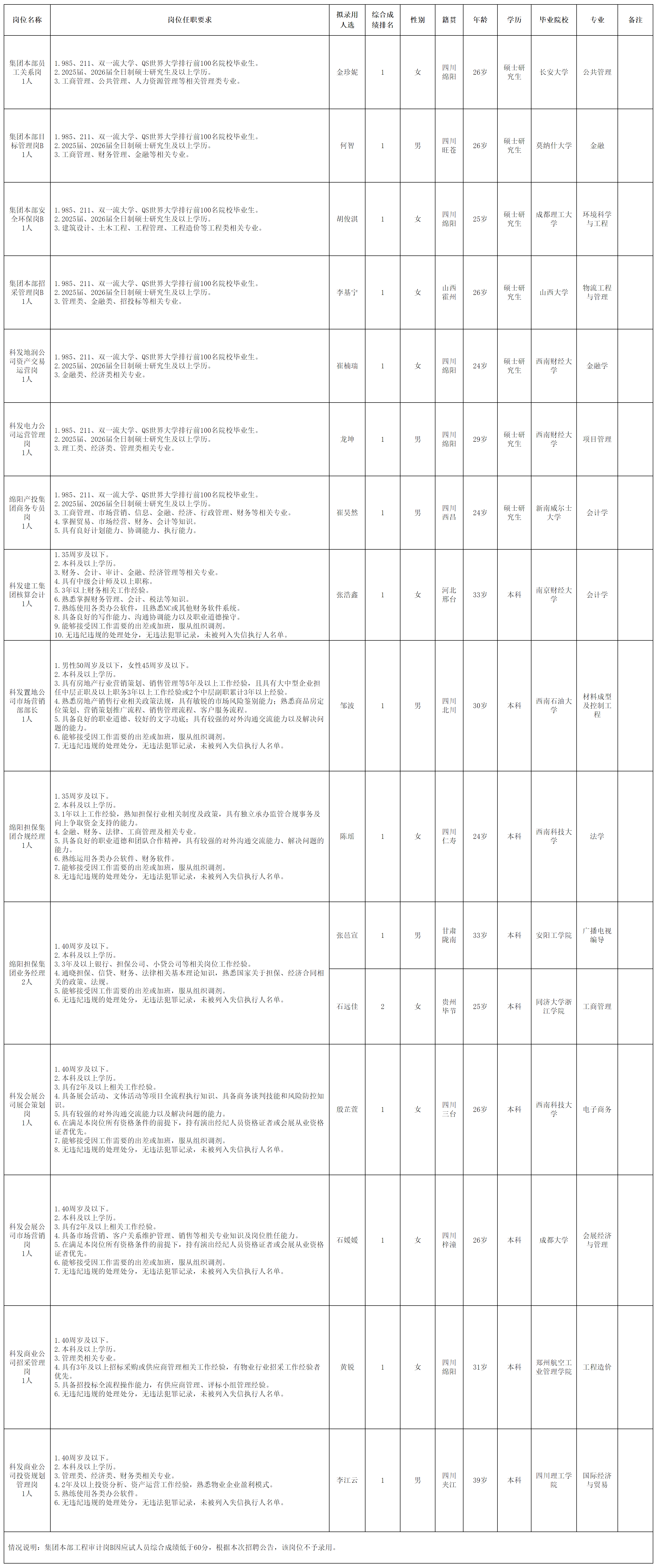 根據(jù)綿陽科技城發(fā)展投資(集團)有限公司發(fā)布的招聘公告及招聘相關規(guī)定,經(jīng)筆試、面試、考察等程序,擬錄用金珍妮等16名同志分別到集團本部及子公司工作,現(xiàn)予以公示,具體情況如下。