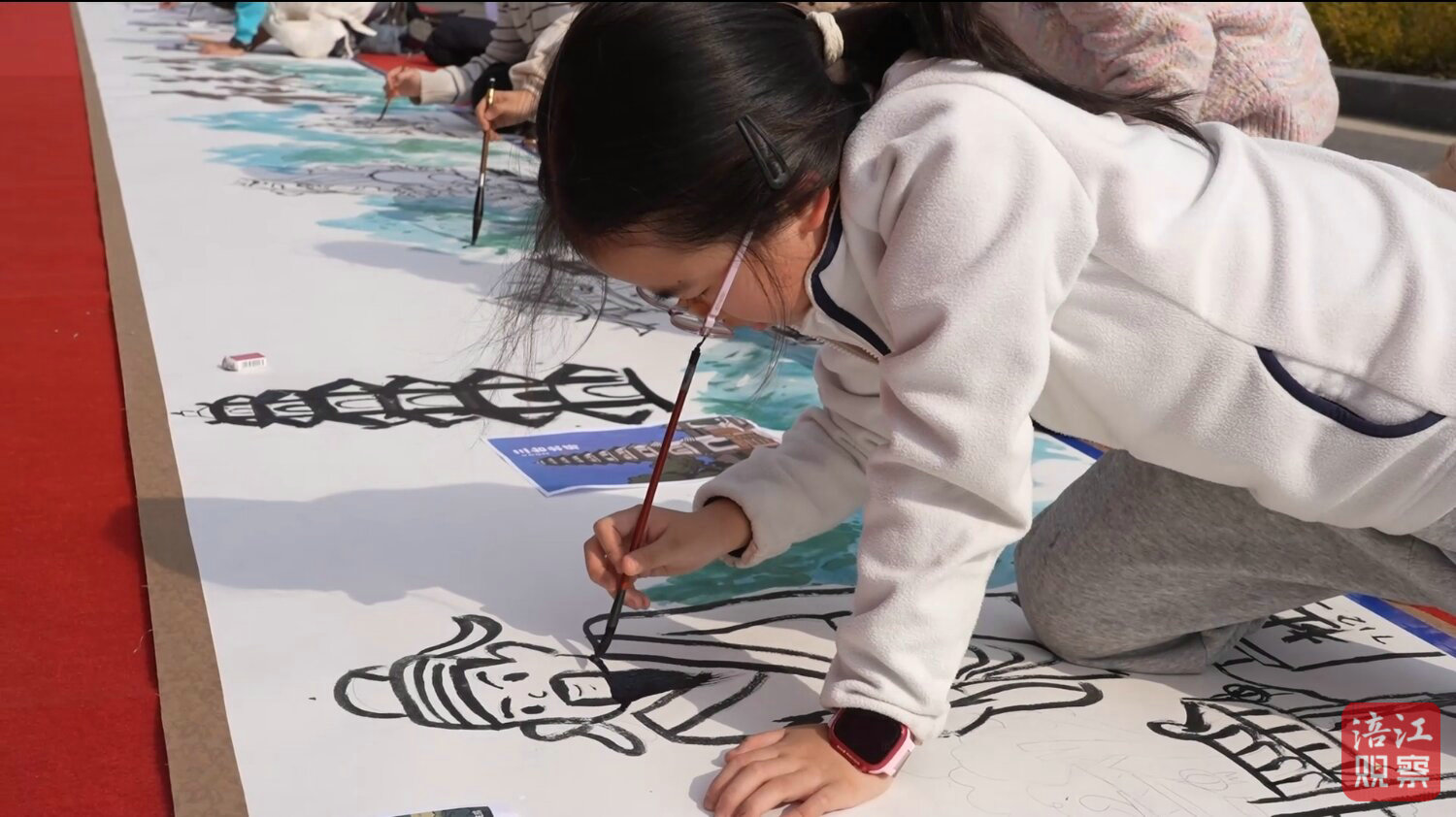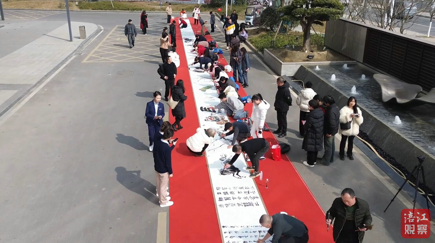 活動(dòng)現(xiàn)場,一幅百米長卷在地面鋪展開來,參與者們提筆蘸墨、傾情創(chuàng)作。靈動(dòng)的花鳥、遒勁的詩句、奔騰的駿馬、熟悉的三臺(tái)標(biāo)志性建筑躍然紙上,馬年的吉祥寓意與家鄉(xiāng)的人文風(fēng)貌在畫卷上交相輝映。