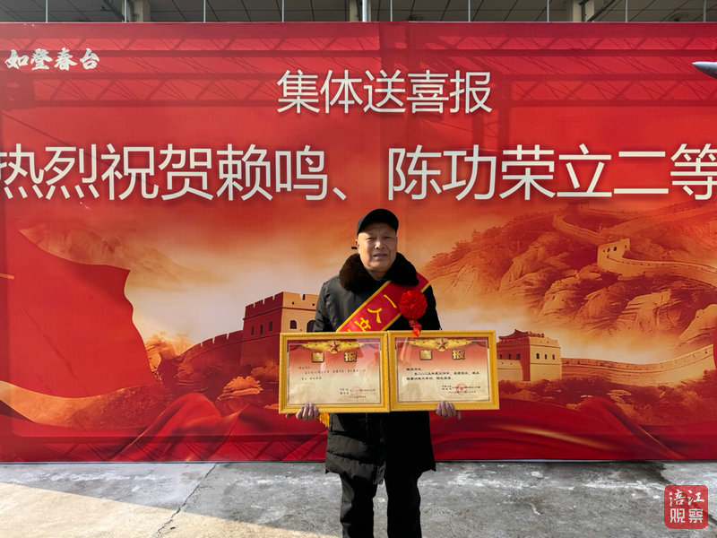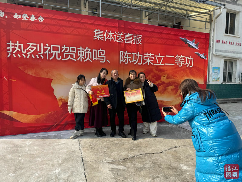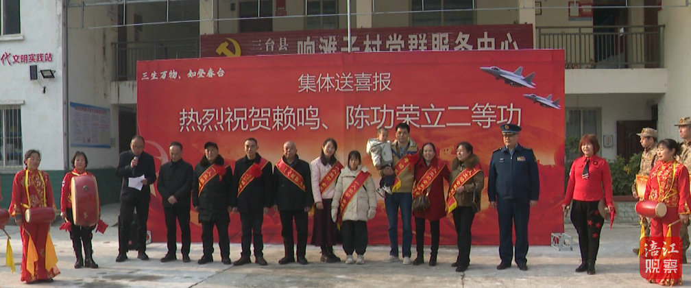 2月11日上午,綿陽(yáng)市三臺(tái)縣樂(lè)安鎮(zhèn)響灘子村村委會(huì)門前喜氣洋洋,鑼鼓喧天。在村黨群服務(wù)中心前的紅色背景板前,“集體送喜報(bào) 熱烈祝賀賴?guó)Q、陳功榮立二等功”幾個(gè)大字格外醒目。背景板上黨徽閃耀、戰(zhàn)機(jī)翱翔,彰顯著軍人的榮耀與擔(dān)當(dāng)。