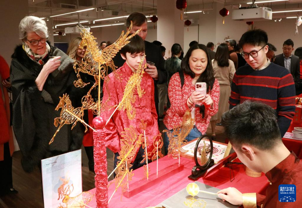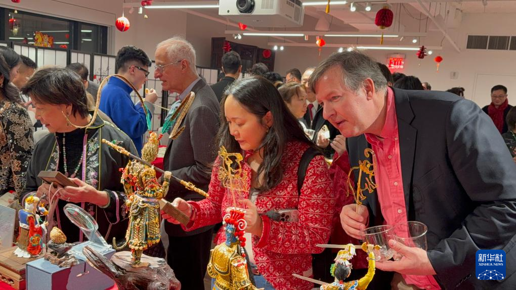 2月9日,在美國紐約曼哈頓南端的華美協(xié)進社中華美食烹飪中心,來賓欣賞面塑作品。新華社發(fā)(劉婧雯攝)