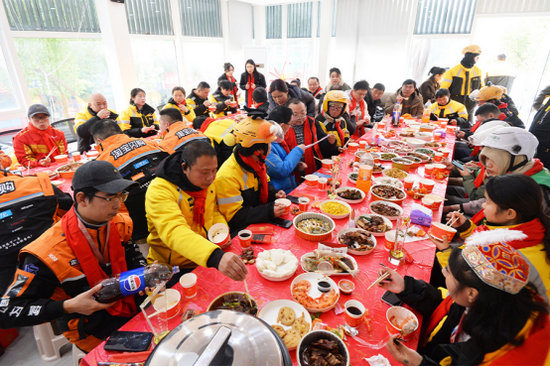 活動尾聲,工作人員為每位“小哥”送上了裝有春聯(lián)、福字、保暖手套及干糧的“暖冬禮包”。熱氣騰騰的團(tuán)圓飯,笑語盈盈的相聚場景,讓這座城市的“奔跑者”們在寒冬里倍感溫暖。(陳周璇)