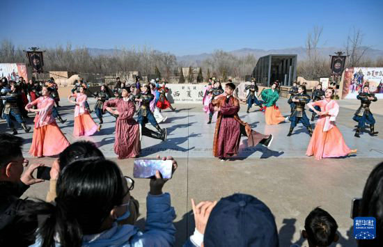 2月13日,游客在銀川市西夏陵景區(qū)觀看《西夏樂集》。