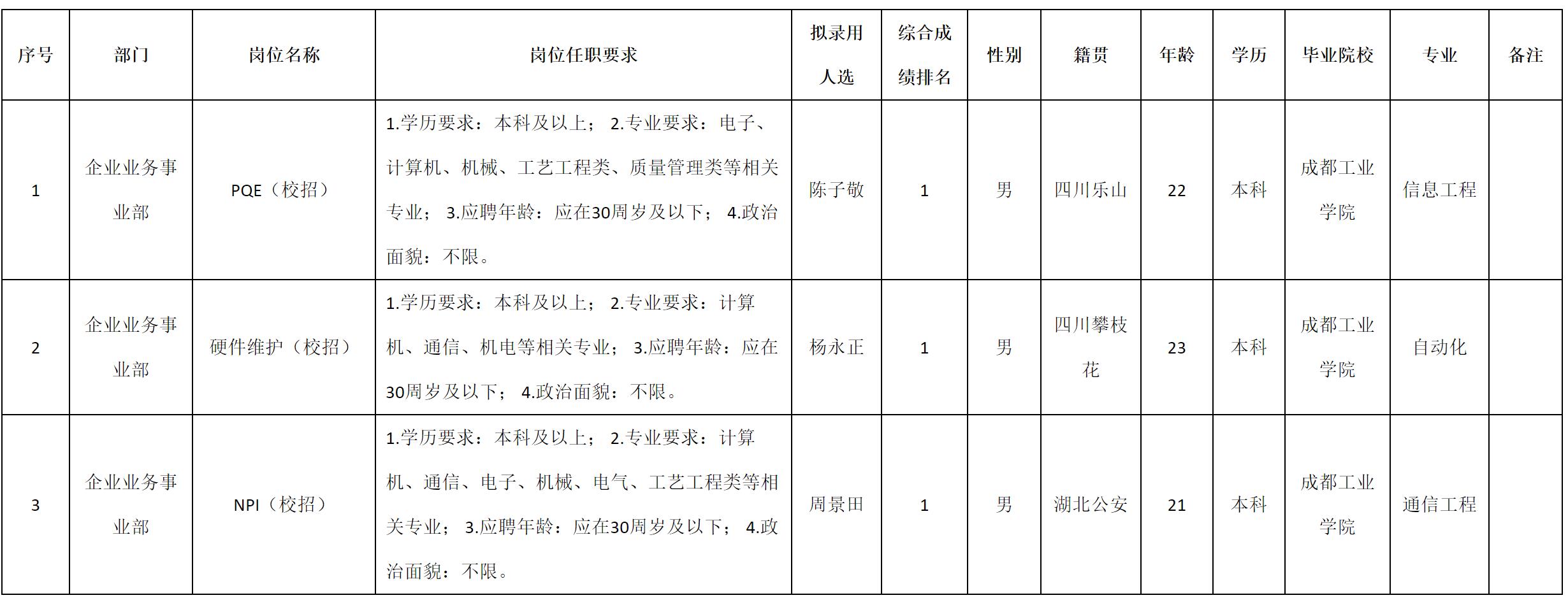 根據(jù)四川九州電子科技股份有限公司發(fā)布的招聘公告及招聘相關(guān)規(guī)定,經(jīng)測試、考察、體檢等程序,擬錄用陳子敬等3名同志到四川九州電子科技股份有限公司工作,現(xiàn)予以公示,具體情況如下: