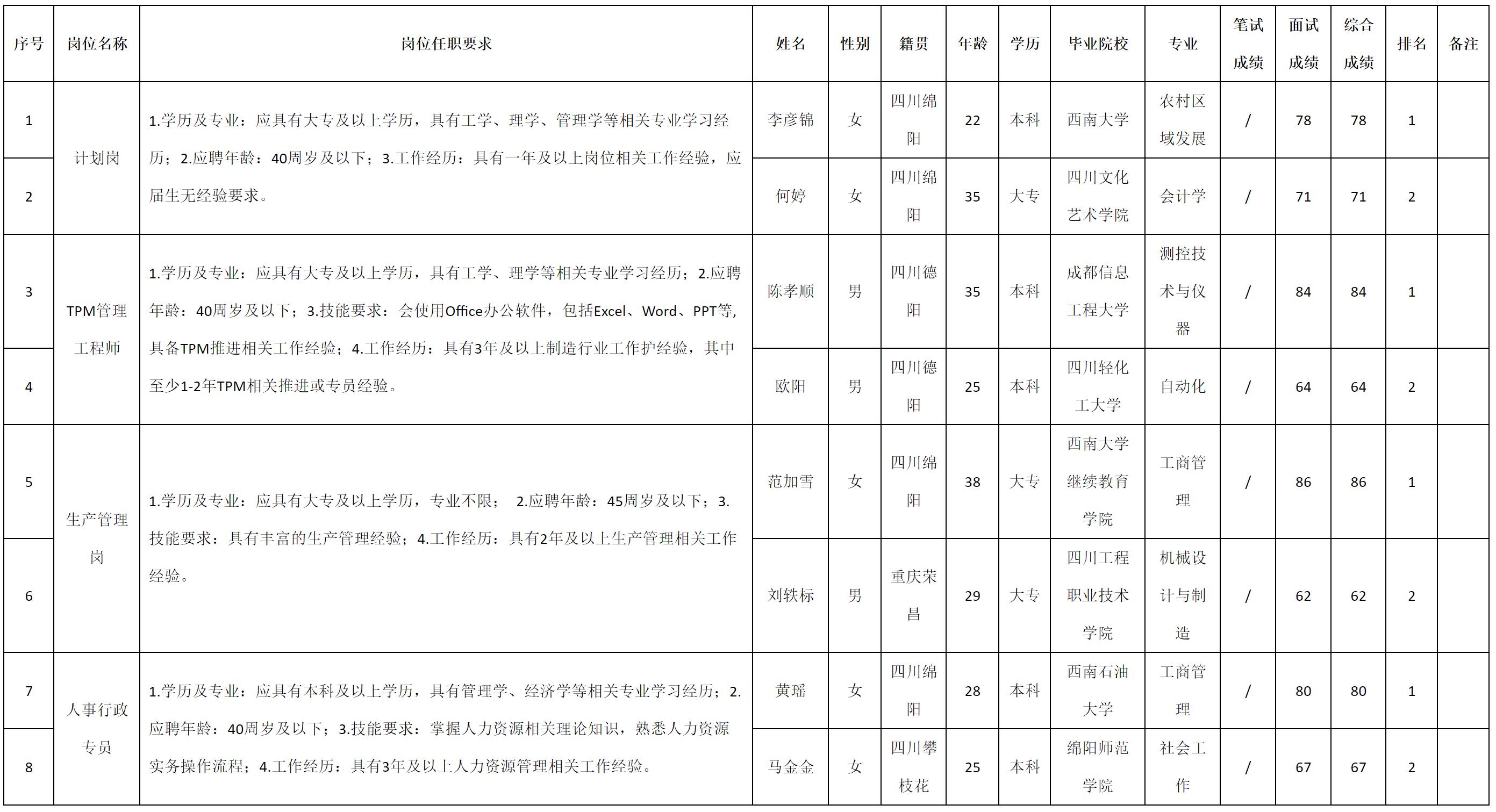 根據(jù)四川九華光子通信技術有限公司發(fā)布的招聘公告及招聘相關規(guī)定,現(xiàn)將測試成績予以公示。
