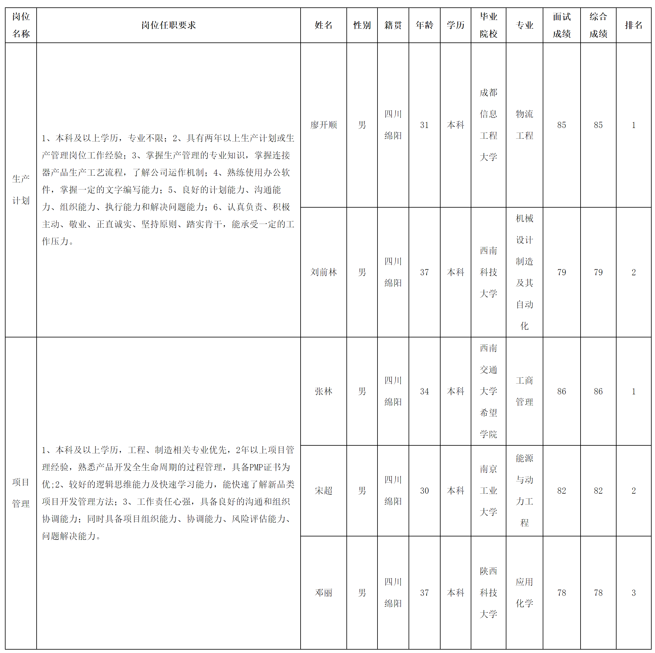 根據(jù)四川華豐科技股份有限公司發(fā)布的招聘公告及招聘相關(guān)規(guī)定,經(jīng)面試等程序,現(xiàn)將測試成績予以公示。