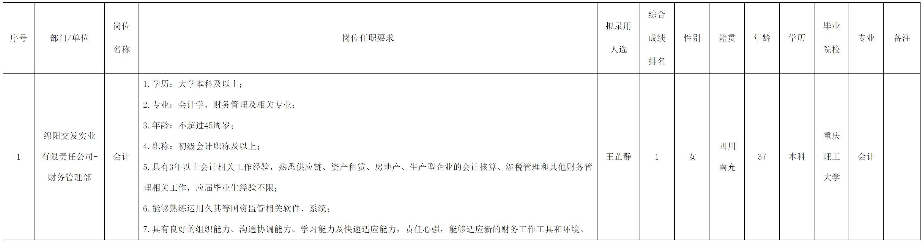 根據(jù)交發(fā)實(shí)業(yè)發(fā)布的招聘公告及招聘相關(guān)規(guī)定,經(jīng)筆試、面試、體檢等程序,擬錄用王芷靜到交發(fā)實(shí)業(yè)公司工作。現(xiàn)予以公示,具體情況如下: