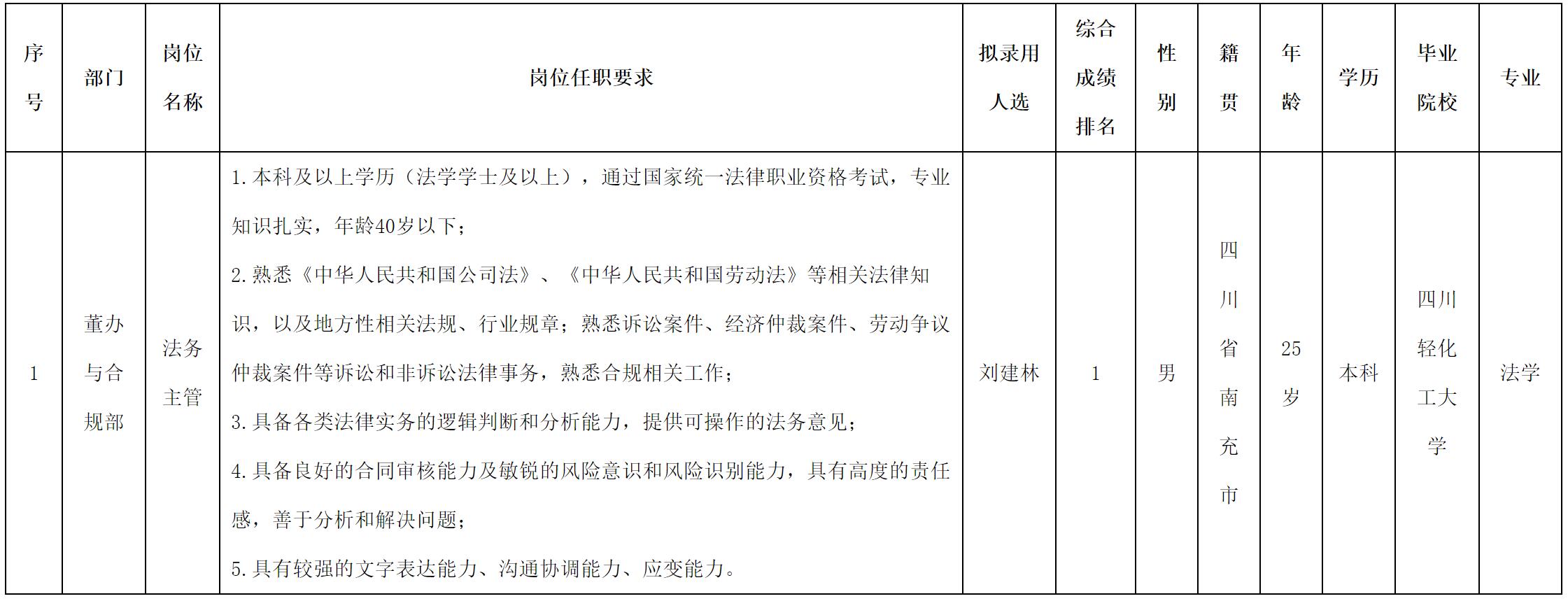 根據(jù)四川愛聯(lián)科技股份有限公司發(fā)布的招聘公告及招聘相關(guān)規(guī)定,經(jīng)面試,擬錄用劉建林同志到董辦與合規(guī)部工作,現(xiàn)予以公示,具體情況如下: