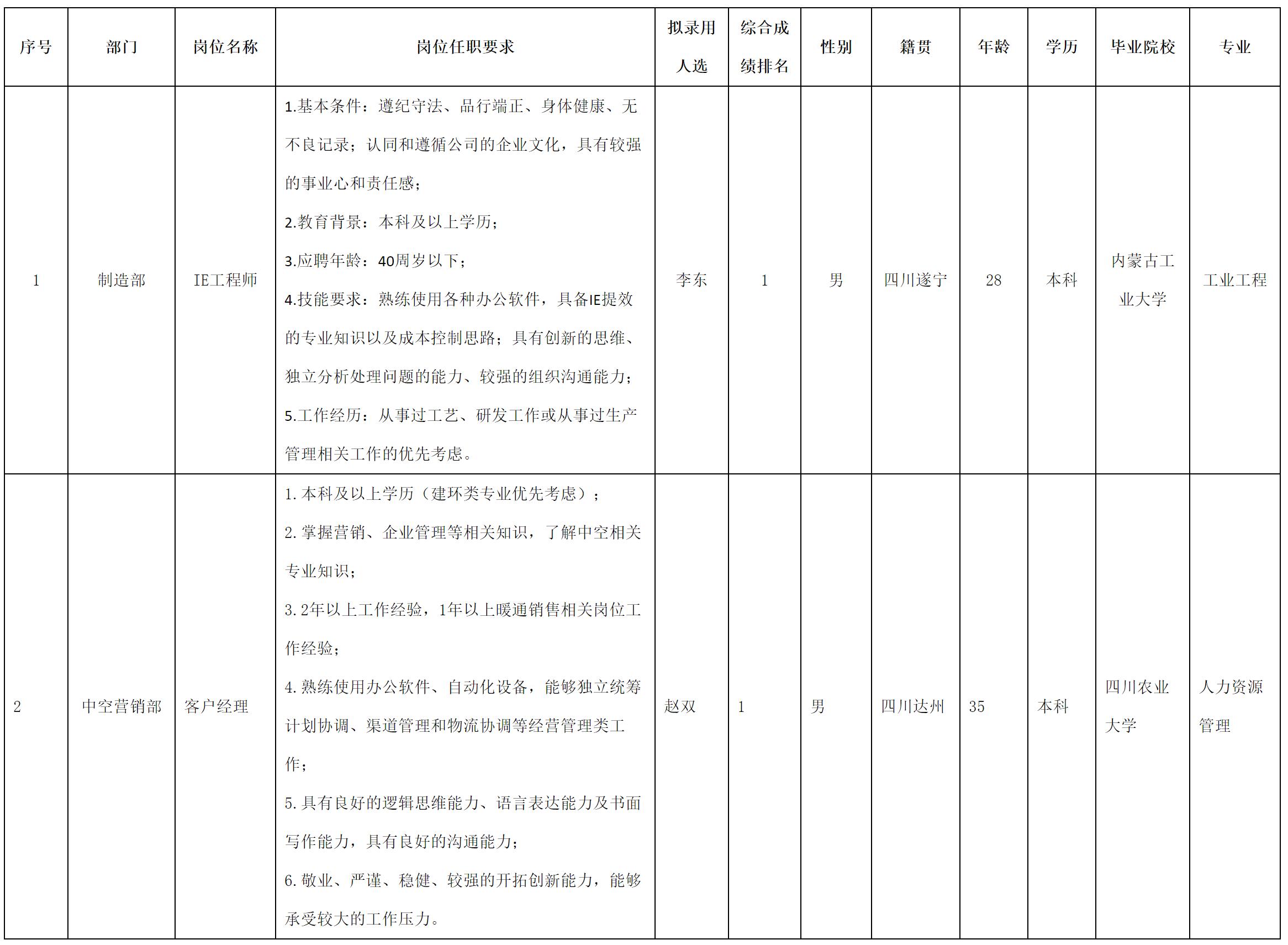 根據(jù)四川長虹空調(diào)有限公司發(fā)布的招聘公告及招聘相關(guān)規(guī)定,經(jīng)面試、測(cè)試、考察、體檢,擬錄用李東等同志到長虹空調(diào)工作,現(xiàn)予以公示,具體情況如下: