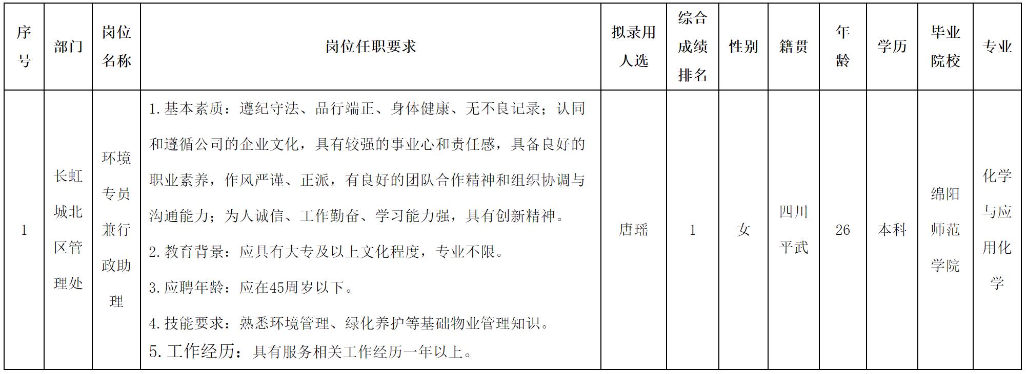 根據(jù)四川長虹物業(yè)服務有限責任公司綿陽分公司發(fā)布的招聘公告及招聘相關規(guī)定,經測試、考察、體檢等程序,擬錄用唐瑤同志到長虹城北區(qū)管理處工作,現(xiàn)予以公示,具體情況如下: